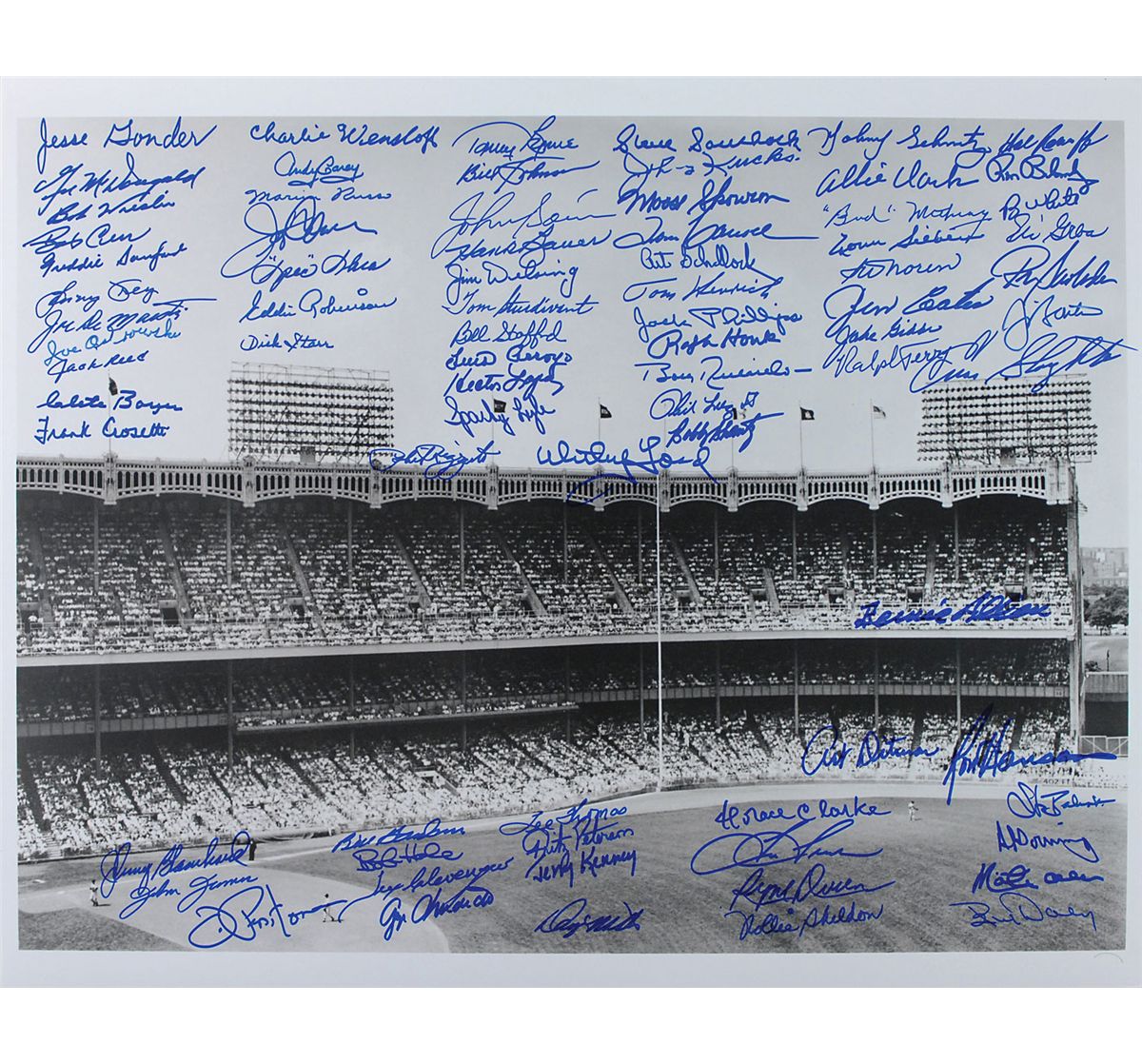 Glossy 20 x 16 photo of the old Yankee Stadium, signed in blue felt tip by over 75 former members of the team. Signers include: Bill Dickey, Phil Rizzuto, Enos Slaughter, Whitey Ford, Frank Crosetti, Tom Henrich, Hank Bauer, Gil McDougald, Bob Cerv, Tommy Byrne, Johnny Sain, Bill ‘Moose’ Skowron, Ryne Duren, Johnny Blanchard, Bobby Richardson, Bobby Shantz, Irv Noren, Ralph Houk, Jim Coates, Roy White, Joe Pepitone, Art Ditmar, Norm Siebern, Clete Boyer, Luis Arroyo, Bill Stafford, Tom Sturdivant, Jack Reed, Sparky Lyle, Tom Tresh, Al Downing, Spec Shea, and Andy Carey. In fine condition.