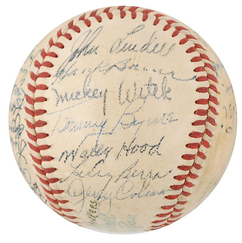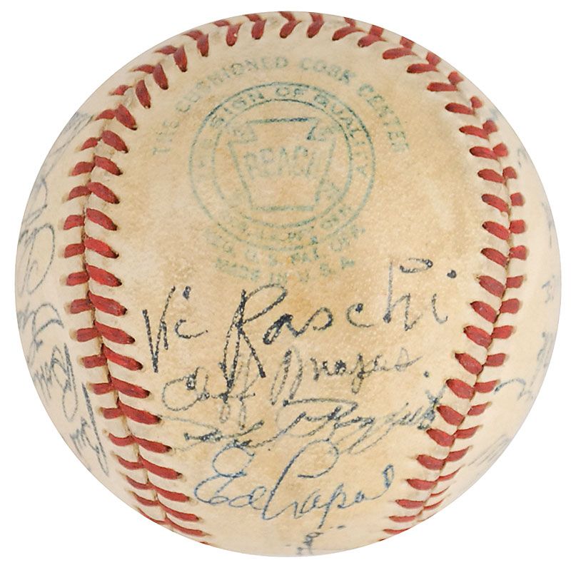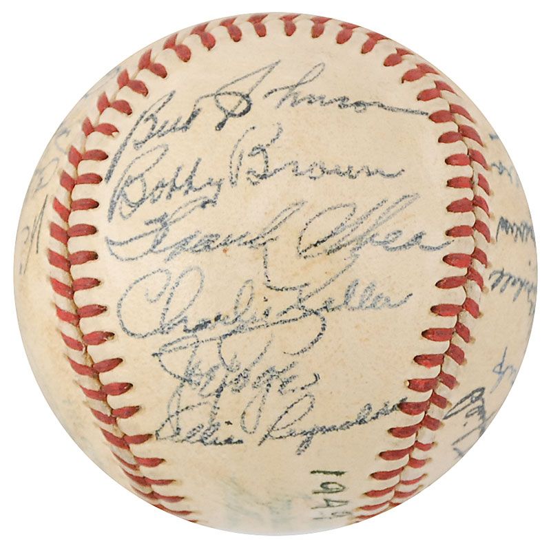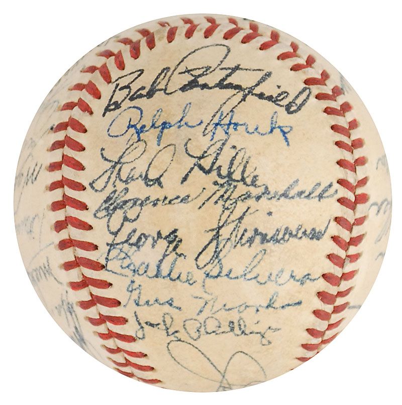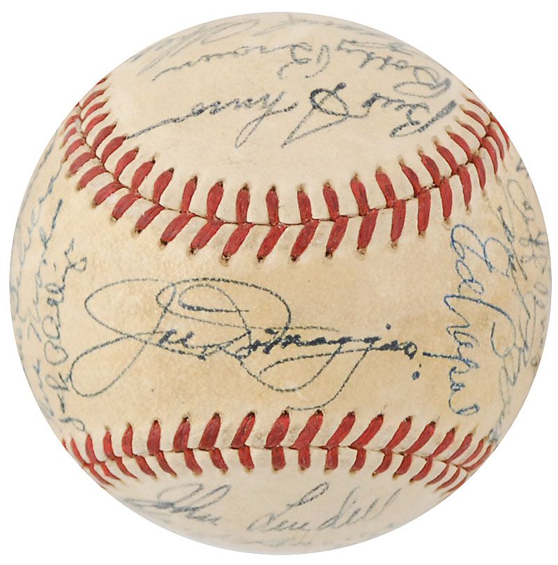 Official Reach American League (Harridge) baseball signed in blue and black ink on the sweet spot and side panels by 26 members of the 1949 World Series champion New York Yankees team. Signers are: Joe DiMaggio (ss), Yogi Berra (signed “Larry”), Phil Rizzuto, Vic Raschi, Cliff Mapes, Ed Lopat, Bob Porterfield, Ralph Houk, Frank Hiller, Clarence Marshall, George Stirnweiss, Charlie Silvera, Gus Niarhos, Jack Phillips, Bill Johnson, Bobby Brown, Frank Shea, Charlie Keller, Joe Page, Allie Reynolds, John Lindell, Hank Bauer, Mickey Witek, Tommy Byrne, Wally Hood, and Jerry Coleman. In fine condition, with unobtrusive overall toning and a ballpoint identification notation near league stamps; DiMaggio’s signature on the sweet spot is particularly bold and attractive.