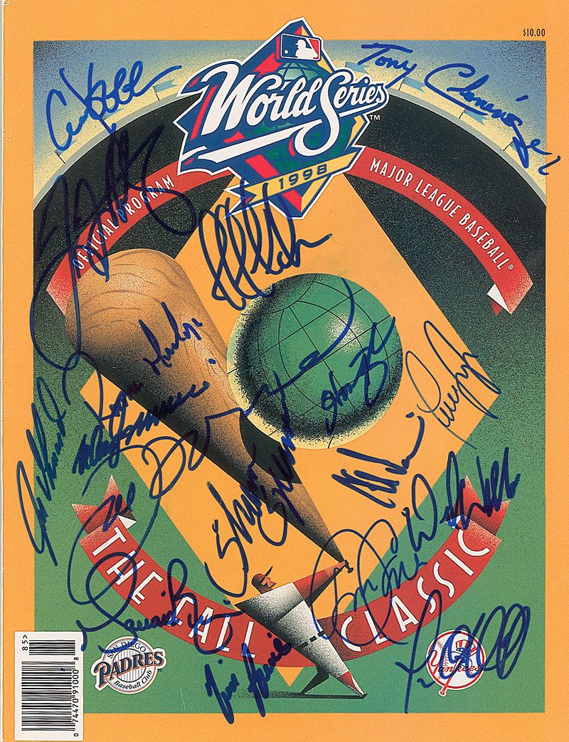 Program for the 1998 World Series which saw the Yankees defeat the San Diego Padres, 8.25 x 10.75, 184 pages, signed on the front cover in blue felt tip by 17 members of the legendary New York ballclub. Signers include: Mariano Rivera, Joe Torre, Paul O’Neill, David Cone, David Wells, Tino Martinez, Joe Girardi, Ramiro Mendoza, Tim Raines, Luis Sojo, Chuck Knoblauch, Jeff Nelson, Shane Spencer, Homer Bush, Don Zimmer, and Tony Cloninger. In very fine condition.
