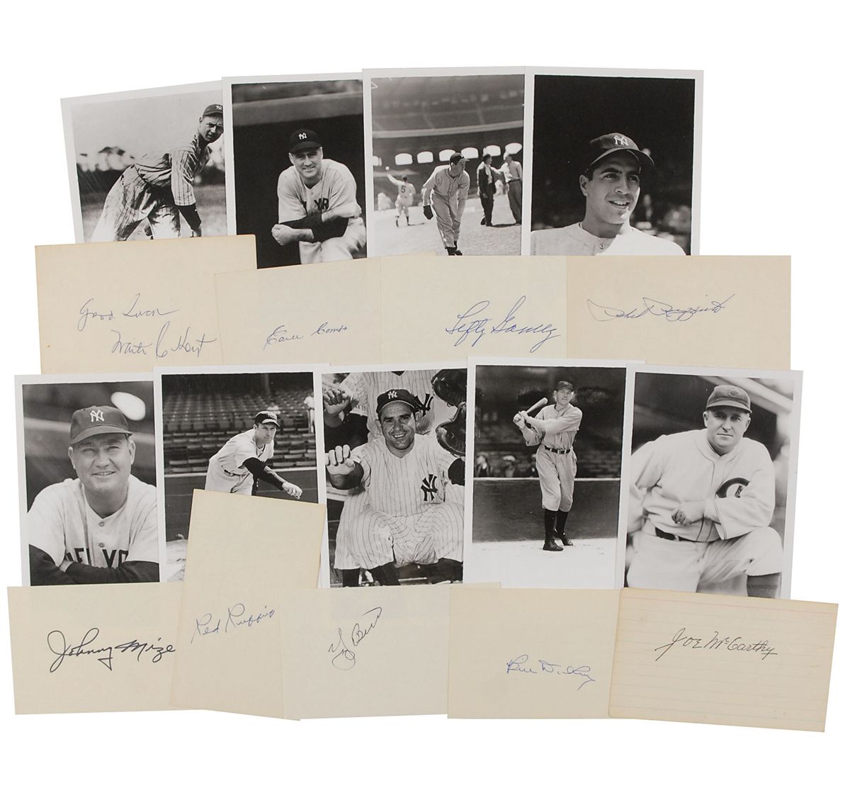 Ballpoint and felt tip signatures of nine former Yankees on individual off-white cards. Signers are: Yogi Berra, Phil Rizzuto, Joe McCarthy, Waite Hoyt, Earl Combs, Lefty Gomez, Johnny Mize, Red Ruffing, and Bill Dickey. In overall fine condition. Each signature is accompanied by a glossy 4 x 6 photo.