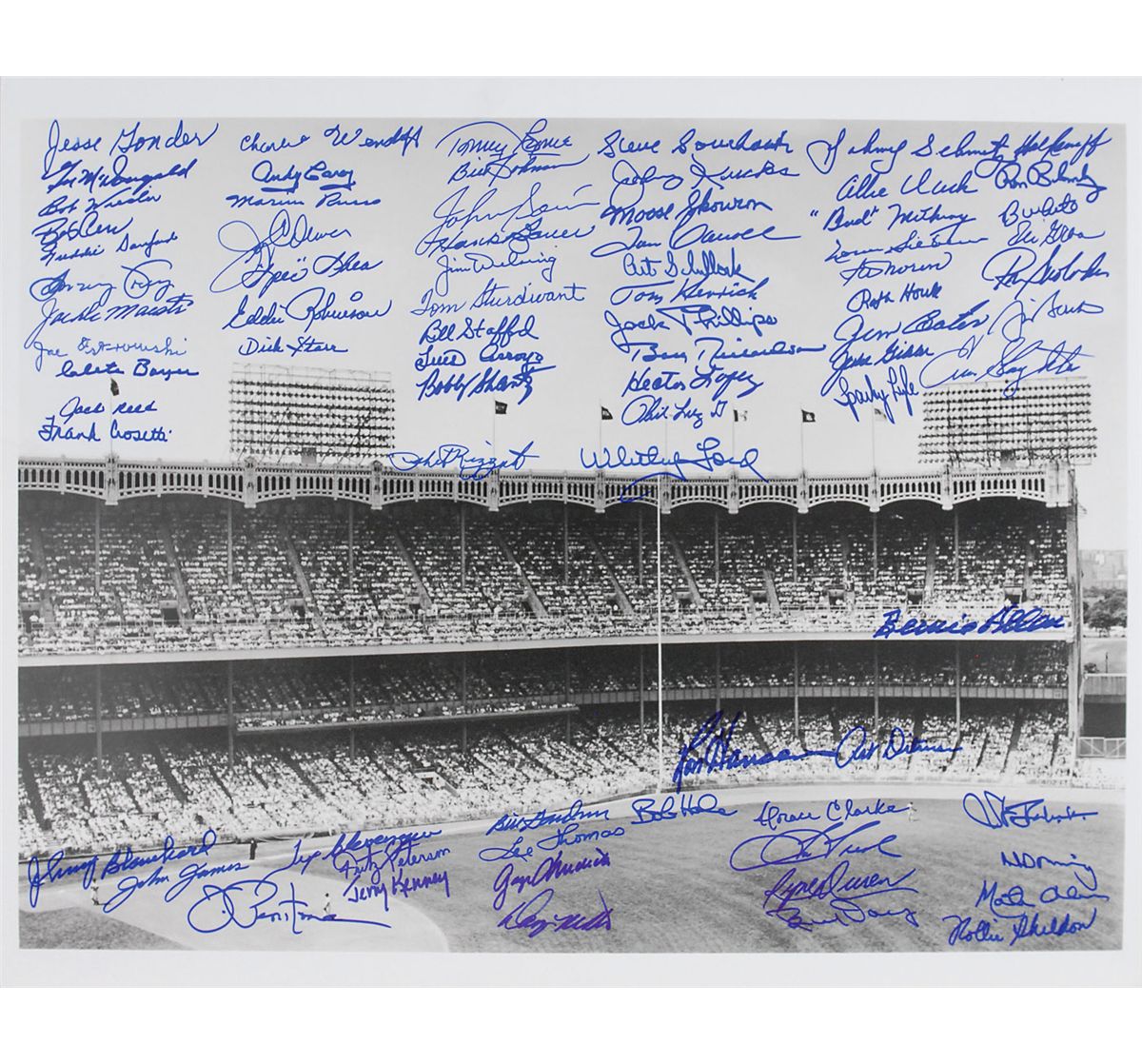 Glossy 20 x 16 photo of the old Yankee Stadium, signed in blue felt tip by over 75 former members of the team, including: Phil Rizzuto, Enos Slaughter, Whitey Ford, Frank Crosetti, Tom Henrich, Hank Bauer, Gil McDougald, Bob Cerv, Tommy Byrne, Johnny Sain, Bill ‘Moose’ Skowron, Ryne Duren, Johnny Blanchard, Bobby Richardson, Bobby Shantz, Irv Noren, Ralph Houk, Jim Coates, Roy White, Joe Pepitone, Art Ditmar, Norm Siebern, Clete Boyer, Luis Arroyo, Bill Stafford, Tom Sturdivant, Jack Reed, Sparky Lyle, Tom Tresh, Al Downing, Spec Shea, Andy Carey, Eddie Robinson, Ron Blomberg, Jim Bouton, and many others. In fine condition.