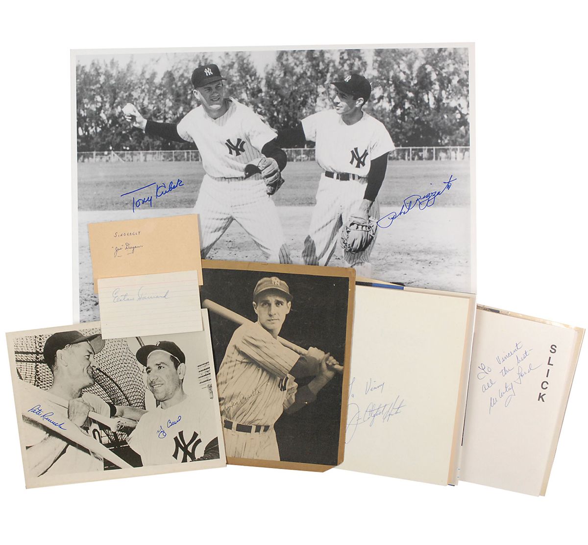 Six items, each signed by a player from the New York Yankees: Yogi Berra and Pete Runnels (SP); Phil Rizzuto and Tony Kubek (oversized SP); Whitey Ford (inscribed book); Jim ‘Catfish’ Hunter (inscribed book); Elston Howard (signature); Frank Crosetti (SP); and Joe Dugan (signature). In overall fine condition.