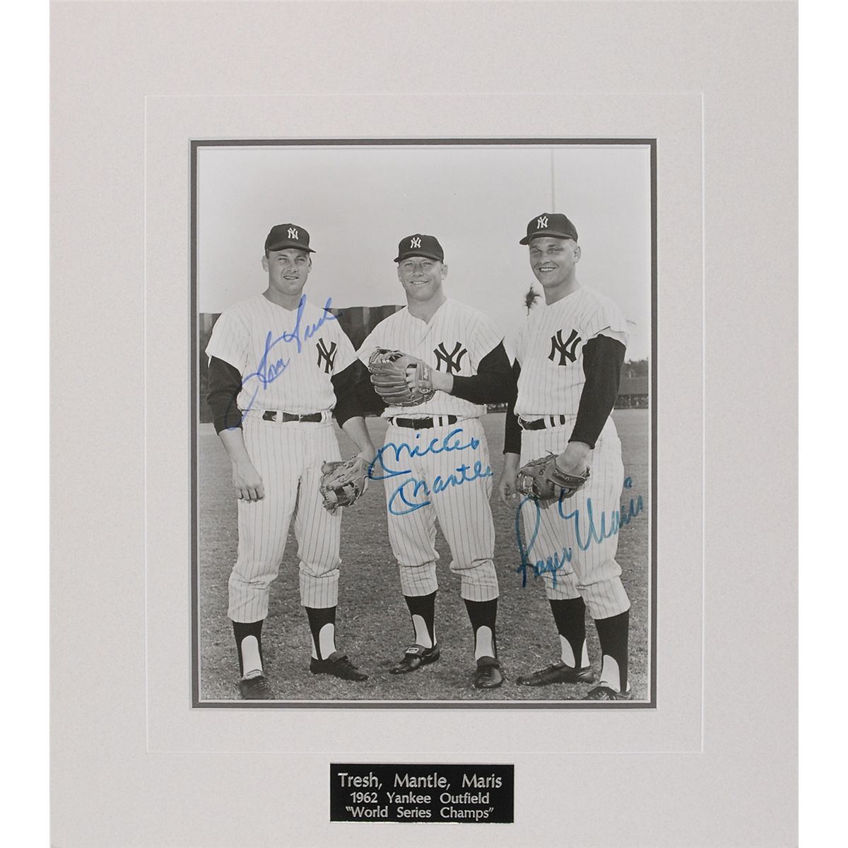 Glossy 7.25 x 9 photo of Mickey Mantle, Roger Maris, and Tom Tresh posing in their Yankees uniforms, each signing in blue felt tip. Permanently affixed to a larger mount and double-matted to an overall size of 12.25 x 14. In fine condition, with minor creasing to Tresh’s cleats.