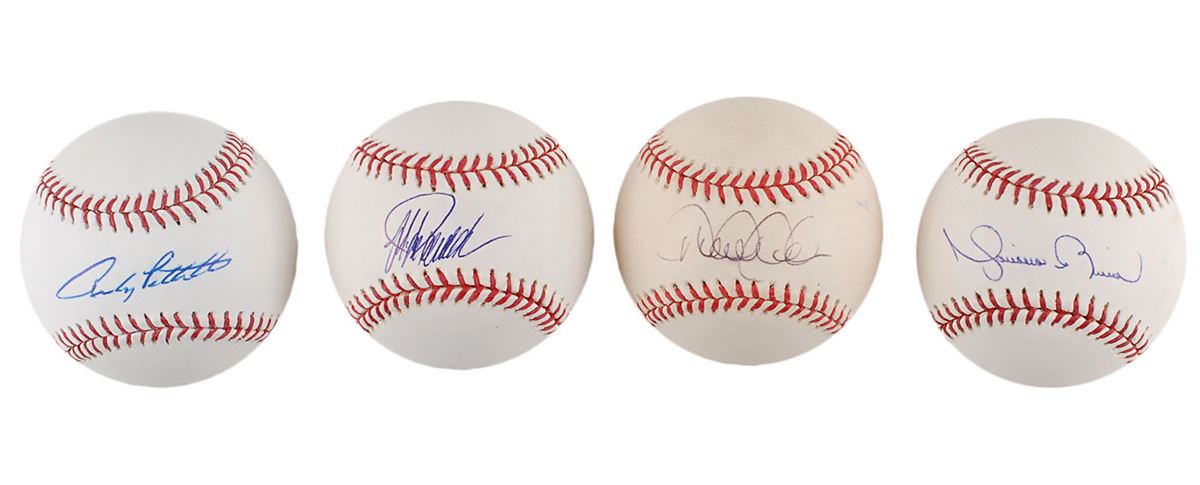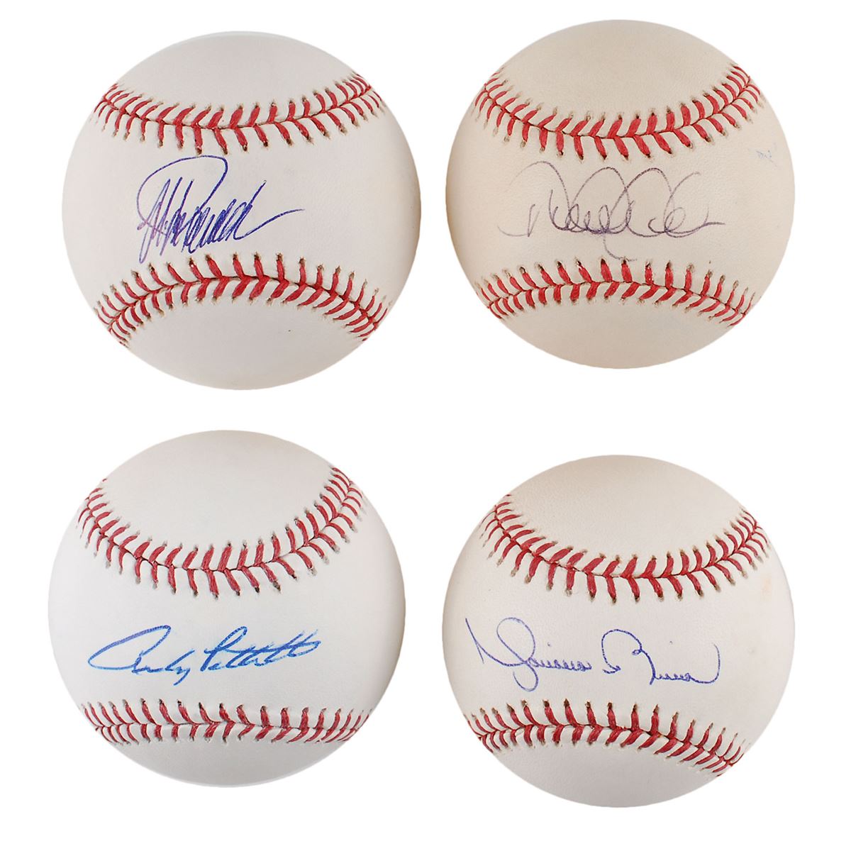Nice collection of four official Rawlings Major League baseballs, each signed on the sweet spot in ballpoint by one of the core members of the Yankees dynasty, including: Derek Jeter (on an official 1996 World Series baseball), Mariano Rivera, Andy Pettitte, and Jorge Posada. Light soiling to the Jeter baseball and trivial brushing to a couple signatures, otherwise overall fine condition.