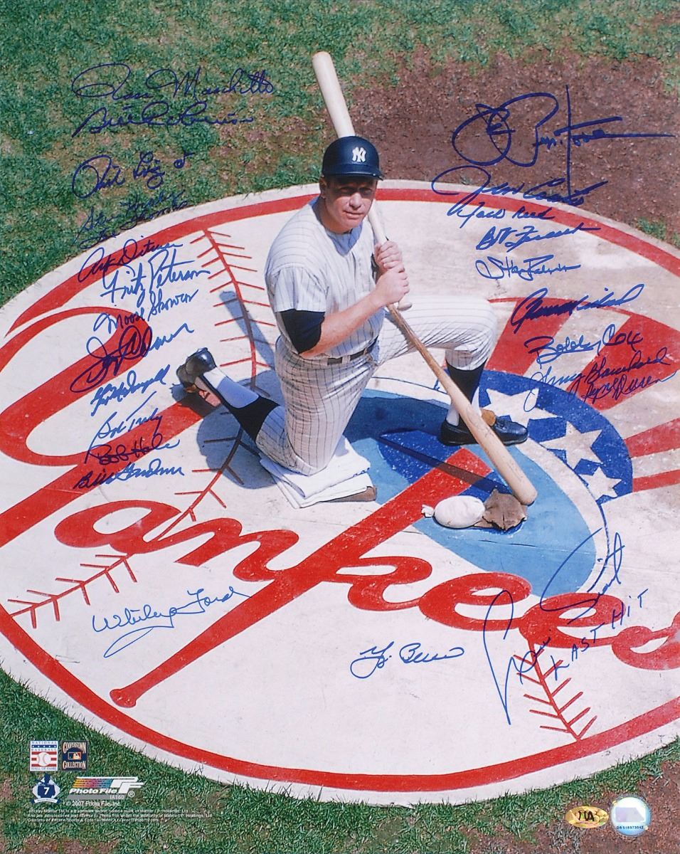 Color glossy 16 x 20 photo of Mantle kneeling inside the New York Yankees home field logo, signed in blue felt tip by twenty-five Yankees players, including: Stan Bahnsen, Yogi Berra, Johnny Blanchard, Jim Coates, Jerry Coleman, Bobby Cox, Art Ditmar, Ryne Dure, Whitey Ford, Bob Friend, Bill Gardner, Bob Hale, Steve Kraly, Phil Linz, Gil McDougald, Gene Michael, Ross Moschitto, Joe Pepitone, Fritz Peterson, Jack Reed, Bill Robinson, Moose Skowron, Lee Thomas, Bob Turley, and Luis Tiant, who adds “Last Hit.” Lower right corner bears two affixed authenticity labels. In fine condition.