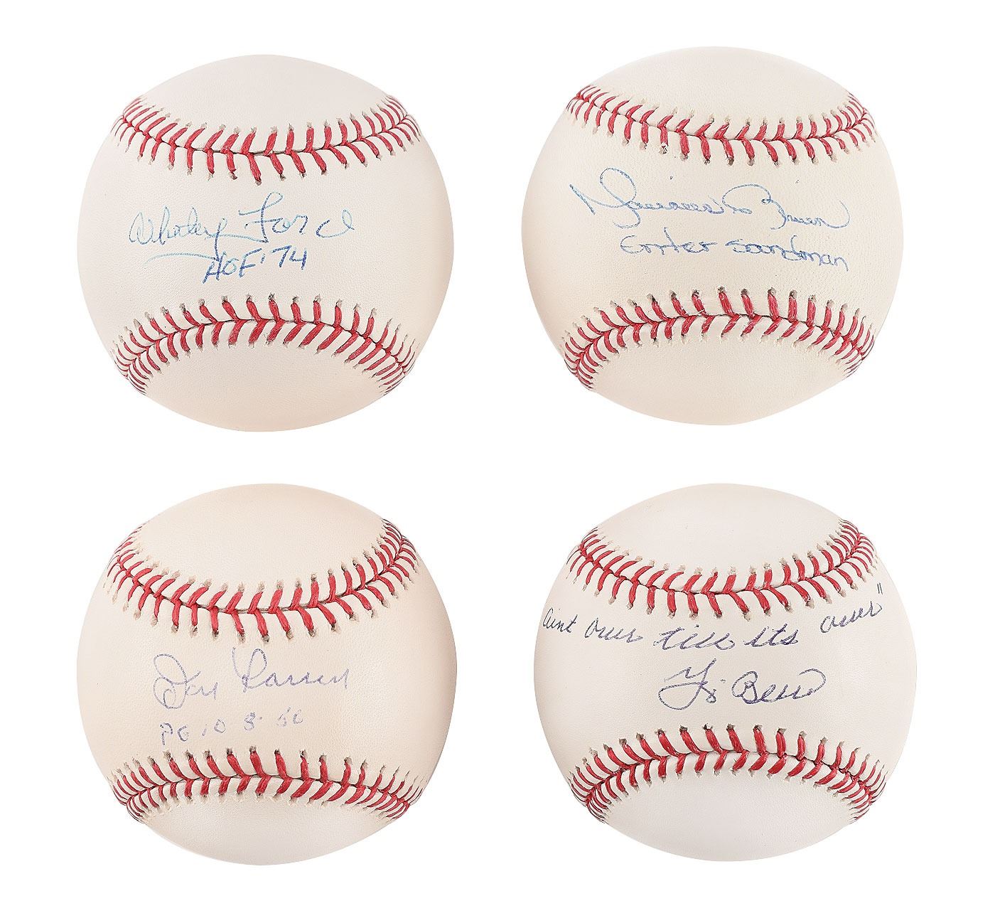 Group of four official Rawlings Major League (Selig) baseballs, individually signed on the sweet spot in ballpoint by a Yankees legend, including: "Yogi Berra, 'It ain't over till it's over,'" "Whitey Ford, HOF '74," "Don Larsen, PG 10–8–56," and "Mariano Rivera, Enter Sandman." In overall very fine condition, with PSA/DNA labels affixed to all but the Larsen baseball. With the exception of the Larsen baseball, all are accompanied by certificates of authenticity from PSA/DNA.
