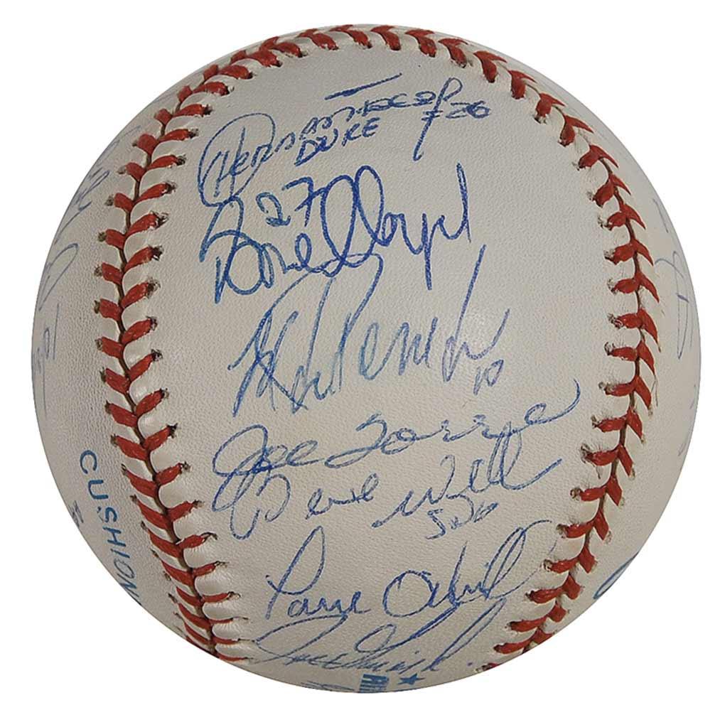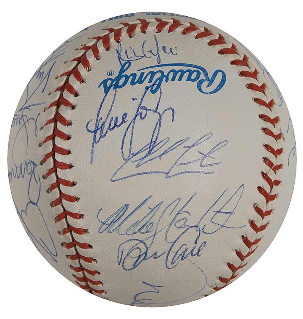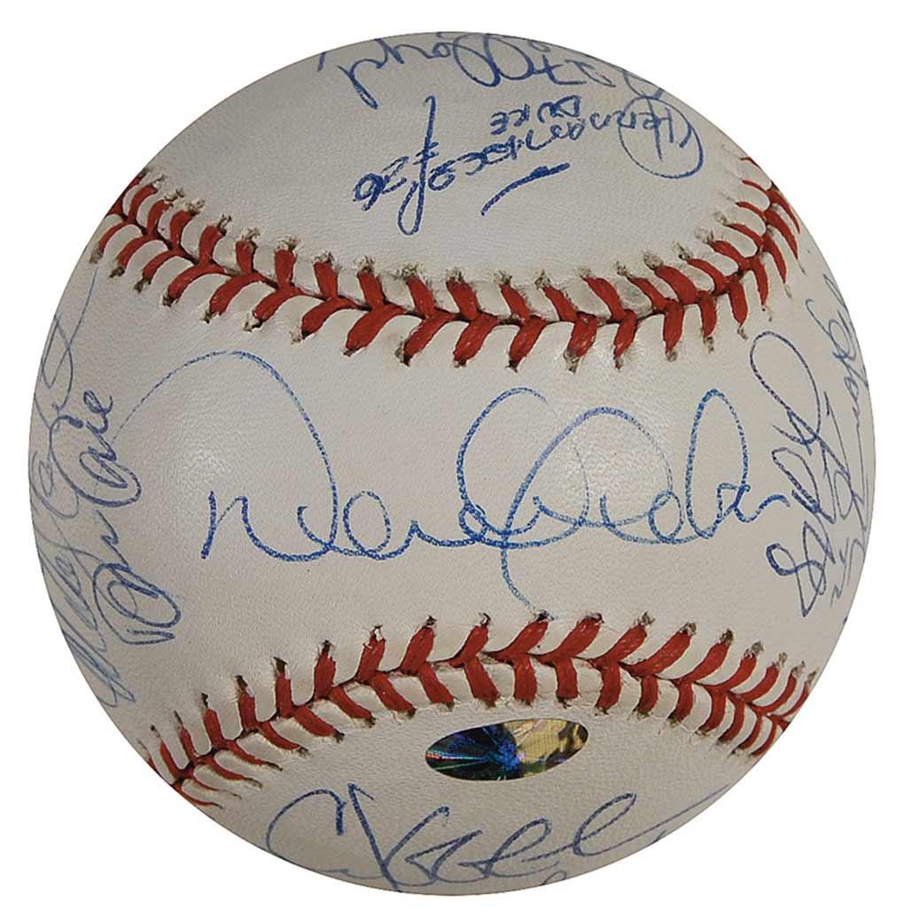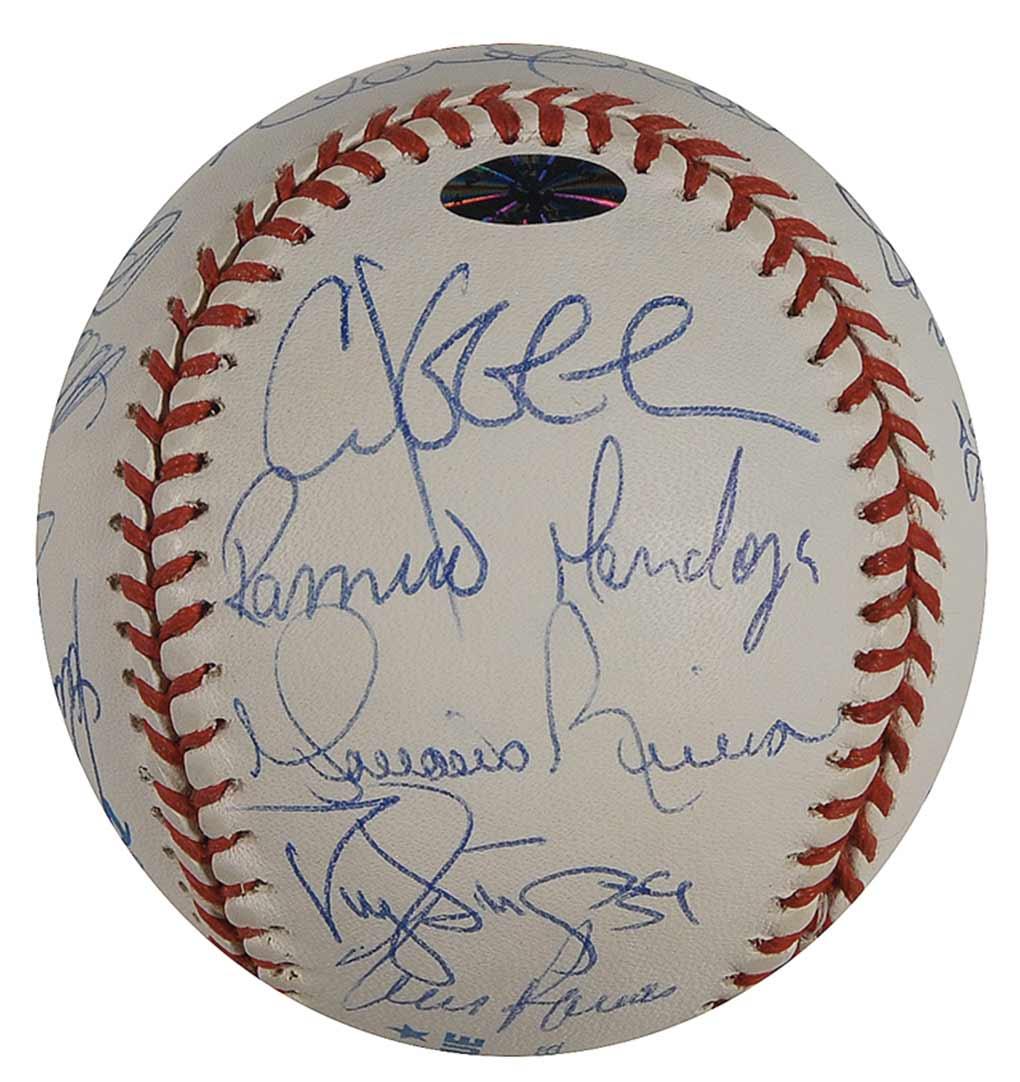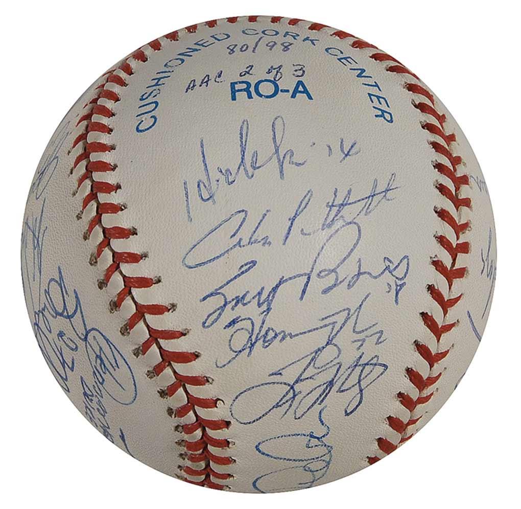 Official Rawlings American League baseball signed in blue ballpoint by 23 members of the 1998 World Champion Yankees. Signers include: Derek Jeter (ss), Mariano Rivera, Chuck Knoblauch, Ramiro Mendoza, Darryl Strawberry, Joe Girardi, Paul O’Neill, Bernie Williams, Joe Torre, Orlando Hernandez, Graeme Lloyd, Hideki Irabu, Andy Pettitte, Scott Brosius, and David Cone. In fine condition.