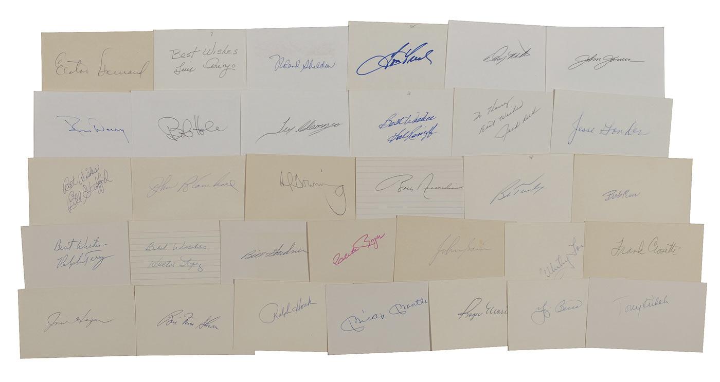 Ink and felt tip signatures of 34 members of the 1961 New York Yankees on individual off-white 5 x 3 cards, a few of them lined. Signers are: Mickey Mantle, Roger Maris, Elston Howard, Whitey Ford, Yogi Berra, Frank Crosetti, Jim Hegan, Moose Skowron, Ralph Houk, John Sain, Wally Moses, Clete Boyer, Billy Gardner, Joe Demaestri, Tony Kubek, Ralph Terry, Hector Lopez, Bob Cerv, Bob Tulley, Bobby Richardson, Al Downing, Johnny Blanchard, Bill Stafford, Jesse Gonder, Jack Reed, Hal Reniff, Bob Hale, Tex Clevenger, Luis Arroyo, Tom Tresh, Bud Daley, Johnny James, Danny McDevitt, and Rollie Sheldon. In fine overall condition. RRAuction COA.