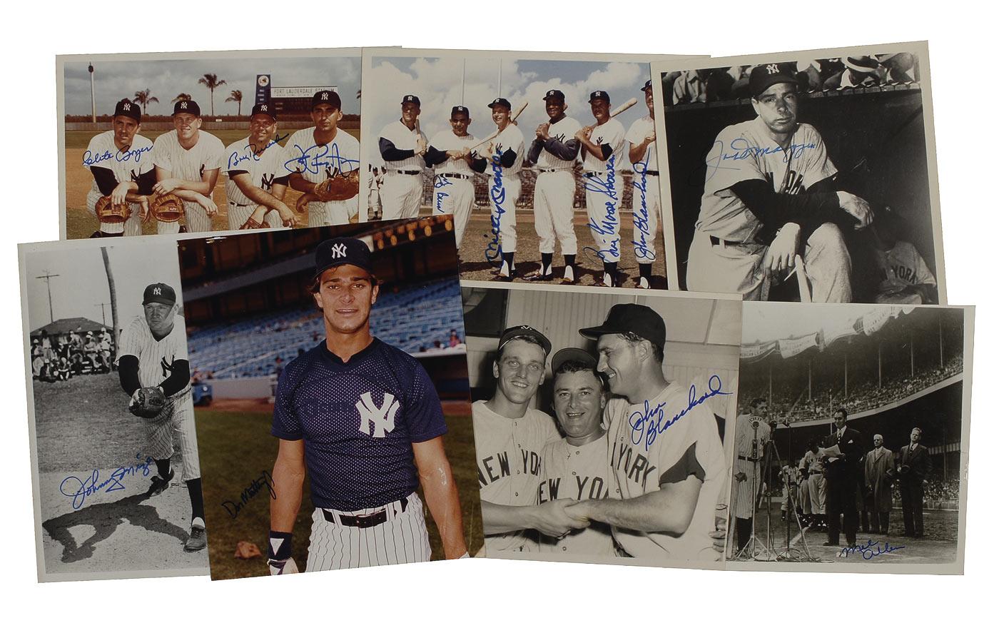 Seven items: 8 x 10 and 10 x 8 photos (three color) each signed in felt tip by the player(s) pictured. Signers are: Clete Boyer, Bobby Richardson, Joe Pepitone; Yogi Berra, Mickey Mantle, Bill Moose Skowron, John Blanchard; Don Mattingly; Mel Allen; Johnny Mize; John Blanchard; and Joe DiMaggio. In overall fine condition, a few with mild creasing and two edge tears to the Allen photo and small impressions to upper left corner of DiMaggio. RRAuction COA.