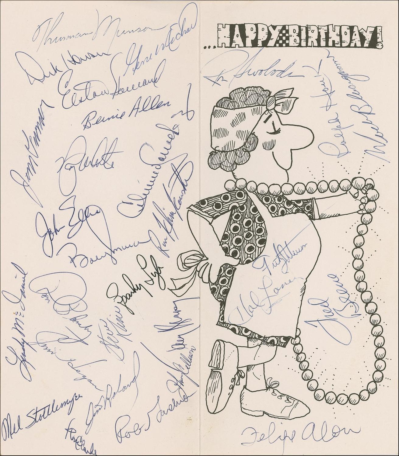 Humorous birthday card, 4.5 x 10.25, signed in ink by 29 members of the 1972 New York Yankees. Signers include: Thurman Munson, Dick Howser, Elston Howard, Jim Turner, Gene Michaels, Bernie Allen, Roy White, Celerino Sanchez, John Ellis, Bobby Murcer, Lindy McDaniel, Ron Blomberg, Jim Hegan, Mel Stottlemyre, Fritz Peterson, Fred Beene, Hal Lanier, Felipe Alou, Sparky Lyle, Horace Clarke, Rob Gardner, Johnny Callison, Jim Roland, Ralph Houk, and Ron Swoboda. In fine condition, with few light creases (heavier at the top and bottom edges) and a few spots of soiling. According to our consignor, the card was passed around the clubhouse during his tenure as a batboy as a birthday gift for his mother.