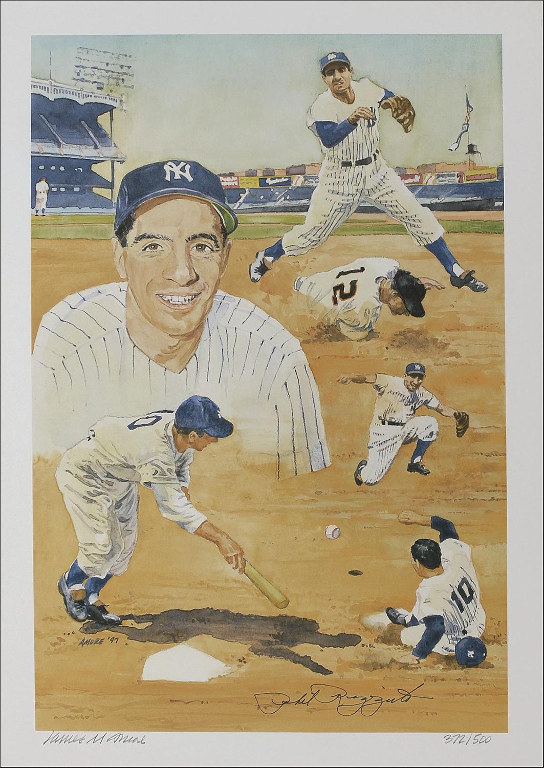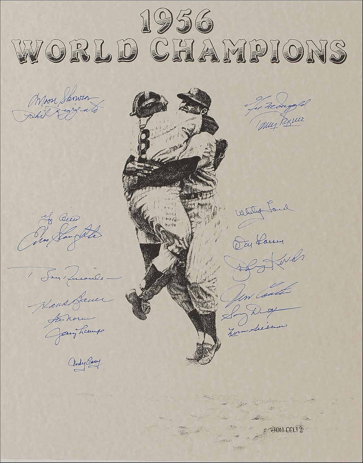 Two signed prints: one titled ‘1956 World Champions,’ 16 x 20, signed in blue felt tip by 17 members of the 1956 World Champion Yankees: Moose Skowron, Phil Rizzuto, Yogi Berra, Enos Slaughter, Jerry Lumpe, Bobby Richardson, Hank Bauer, Irv Noren, Andy Carey, Gil McDougald, Tommy Byrne, Whitey Ford, Don Larsen, Johnny Kucks, Jim Coates, Sonny Dixon, and Norm Siebern; and a color limited edition composite print, 14 x 20, signed in blue felt tip by Rizzuto and in pencil by the artist, James Amore. In fine condition.