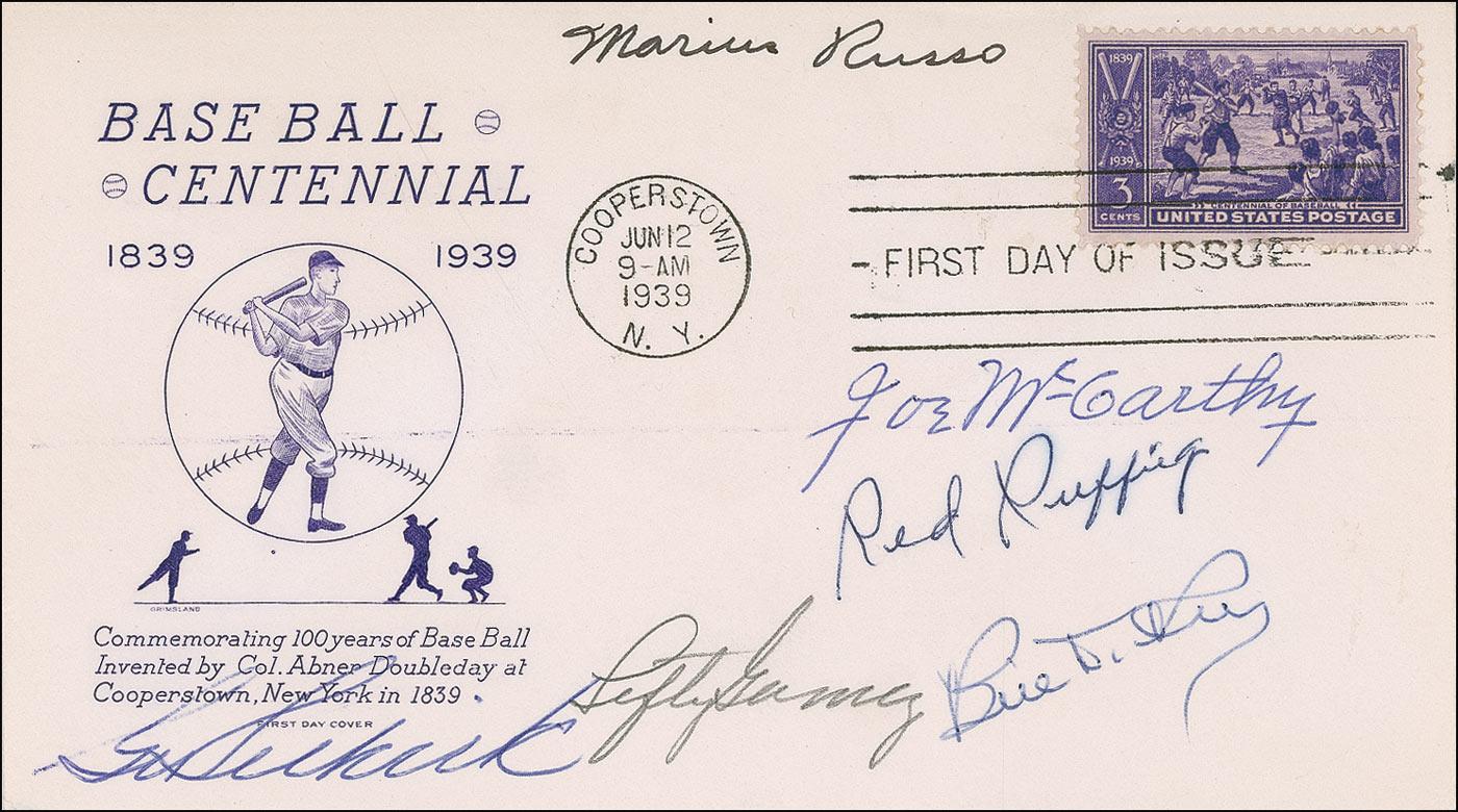 FDC with a cachet honoring the 1939 Baseball Centennial, signed in blue or black ink by six one-time members of the 1939 New York Yankees: Joe McCarthy, Red Ruffing, Bill Dickey, Lefty Gomez (pencil), Marius Russo, and George Selkirk. In fine condition, with light handling wear, scattered toning, and an errant line of ink from the printing process.