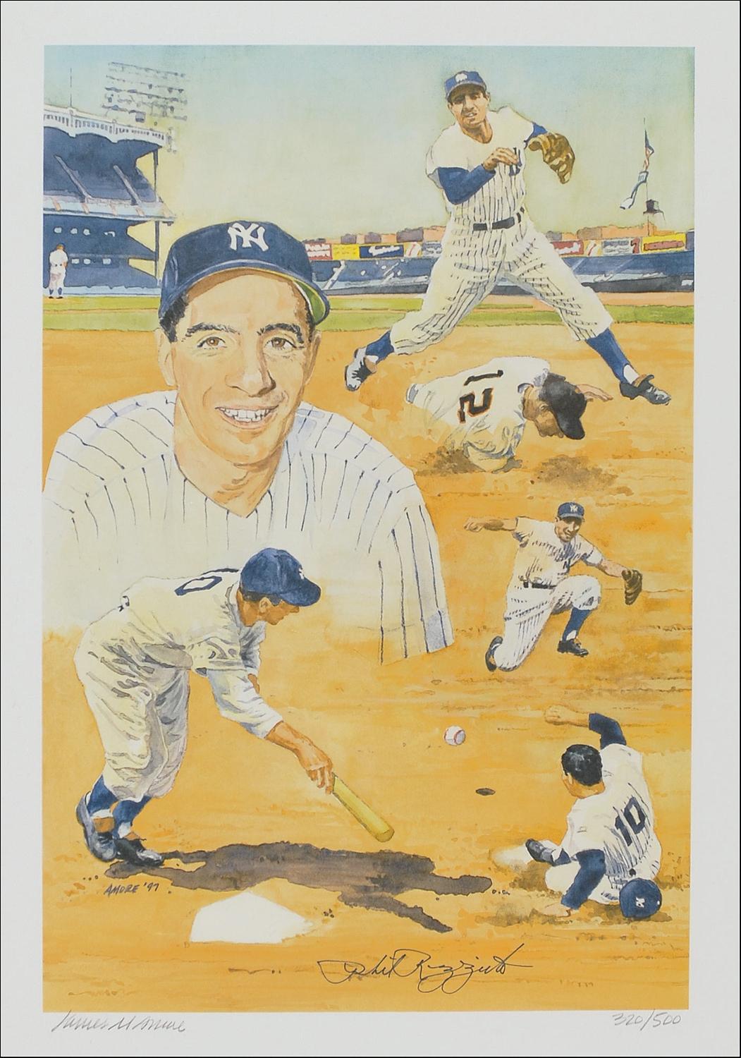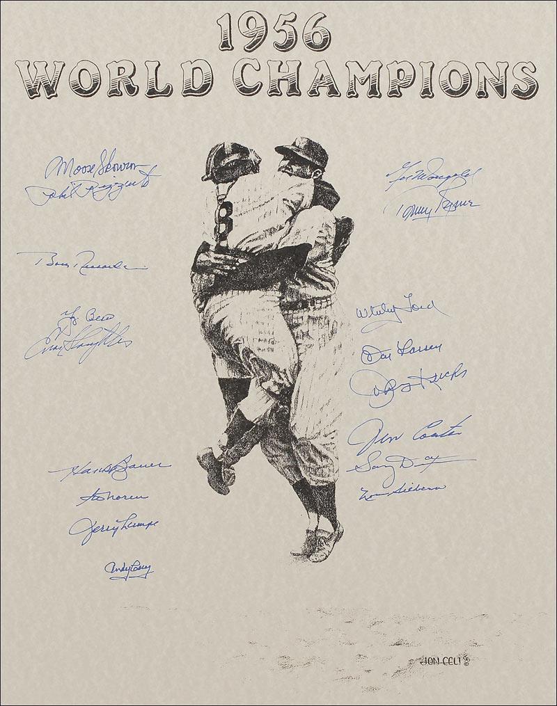 Two prints: a print titled ‘1956 World Champions,’ 16 x 20, signed in blue felt tip by 17 members of the 1956 World Champion Yankees: Moose Skowron, Phil Rizzuto, Yogi Berra, Enos Slaughter, Jerry Lumpe, Bobby Richardson, Hank Bauer, Irv Noren, Andy Carey, Gil McDougald, Tommy Byrne, Whitey Ford, Don Larsen, Johnny Kucks, Jim Coates, Sonny Dixon, and Norm Siebern; and a color limited edition 14 x 20 composite print of Phil Rizzuto, #320/500, signed in blue felt tip by Rizzuto, and also signed in pencil by the artist. In fine condition.