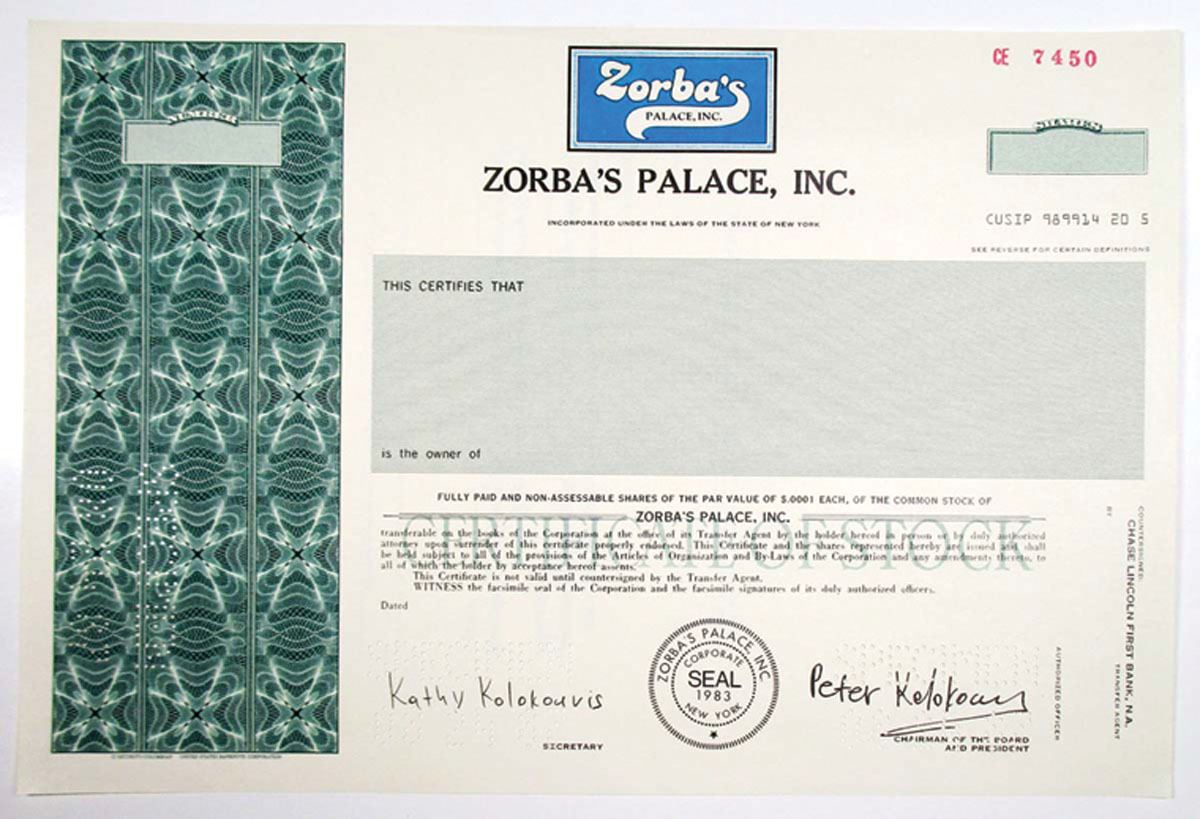 NY. Zorba's Palace, Inc., 1987 Odd Shares Specimen Stock Certificate, VF SC-USBN