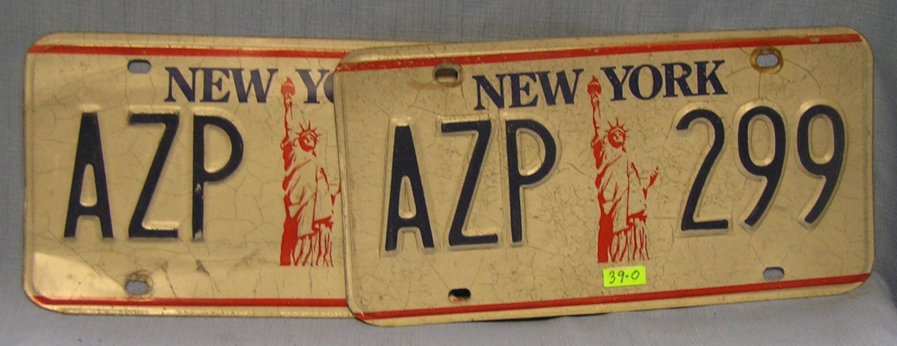 Pair of vintage NY license plates with Statue of Liberty design est. value 50.00-$75.00