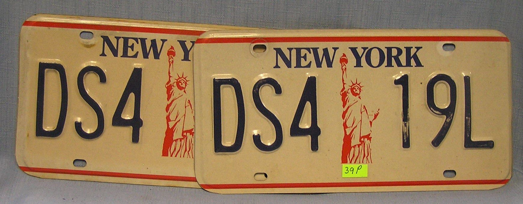 Pair of vintage NY license plates with Statue of Liberty design est. value 50.00-$75.00
