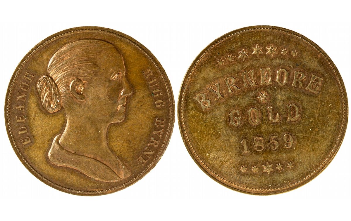 1859 Obv.: Eleanor Rugg Byrne (portrait); Rev.: Byrneore / Gold / 1859. Struck by George H. Lovett of New York City, only 72 were made on copper, brass, white metal and gold planchets. This copper piece has smooth edges rather than reeded and is in outstanding almost uncirculated condition, though uncertified. HKA#62372