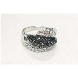 Joshua Lieff Designer Rhodium Plated Ring With Black and Clear Swarovski Crystals