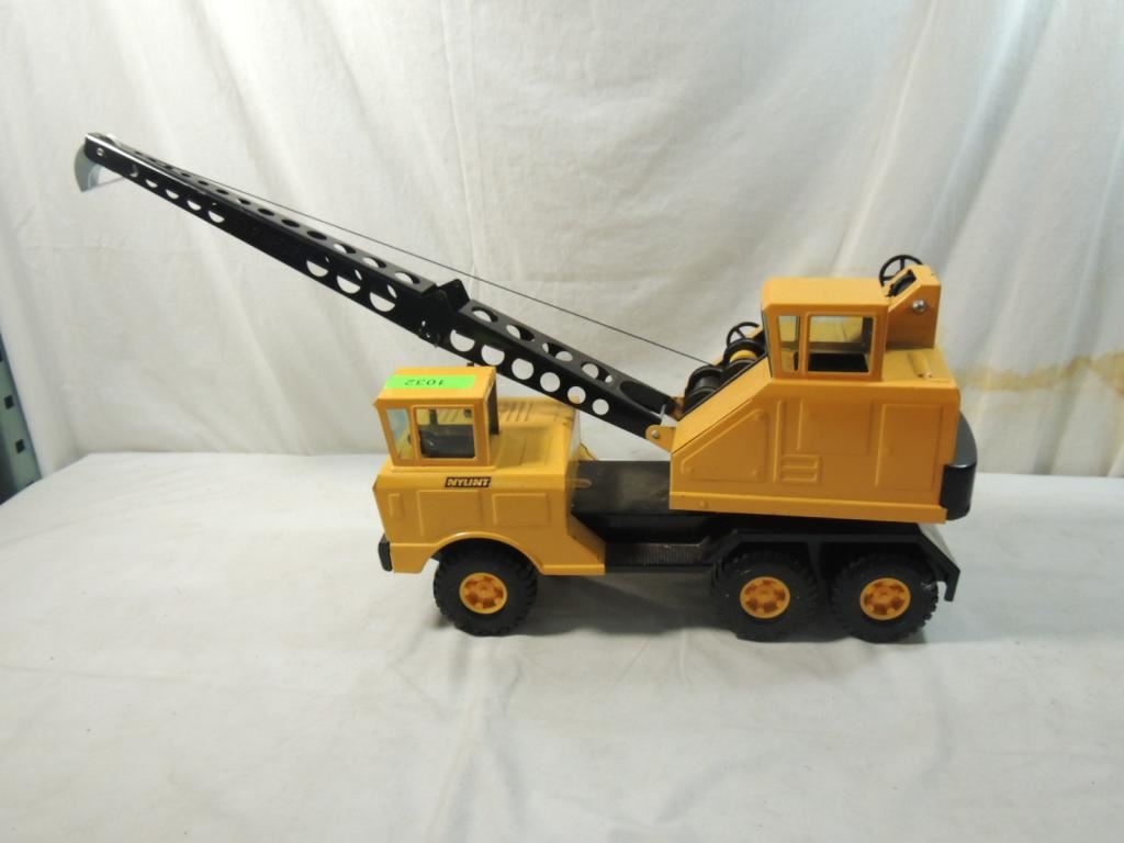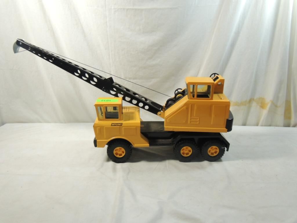 PRESSED METAL CRANE TOY, NYLINT YELLOW CONSTRUCTION TOY TRUCK, VINTAGE TRUCK, AS SHOWN SEE PHOTO FOR MORE DETAILS.