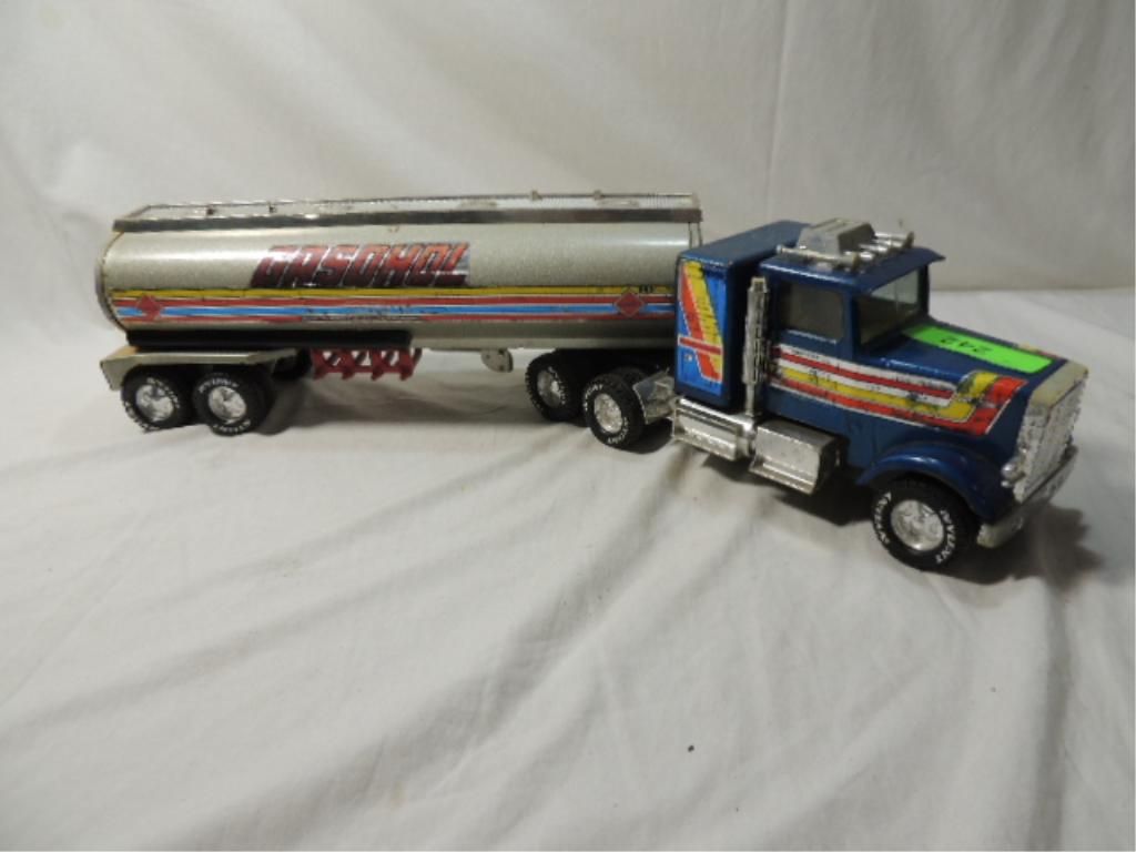 NYLINT PRESSED METAL TOY SEMI & GAS TANKER. 24.5"L AS SHOWN. VIEW PICTURE FOR DETAIL