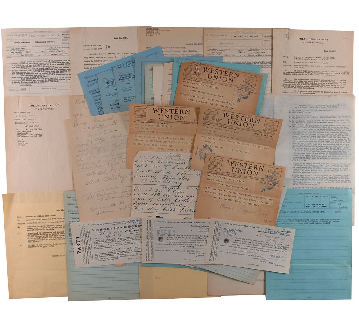 Collection of NYPD reports and documents from Canevari’s time on the bomb squad, many related to bomb investigations, dated from throughout the 1930s. Consists of over 40 pieces (many carbon copies), including typed police reports and witness testimony. One testimonial, in part: “I could see sticks of dynamite…the end not connected with the wires was up against the east rail on three, and two wires coming out of the other end of the bomb were laying in the dynamite box.” Another report, in part: “Investigation shows…hand grenade was empty and harmless apparently a war relic.” Another, in part: “I accompanied Detective Eugene S. Canevari…while making a confidential investigation relative to the making and selling of Bombs at Somerville, N. J.” In overall fine condition, with expected document wear. Provenance: Eugene Canevari Collection.