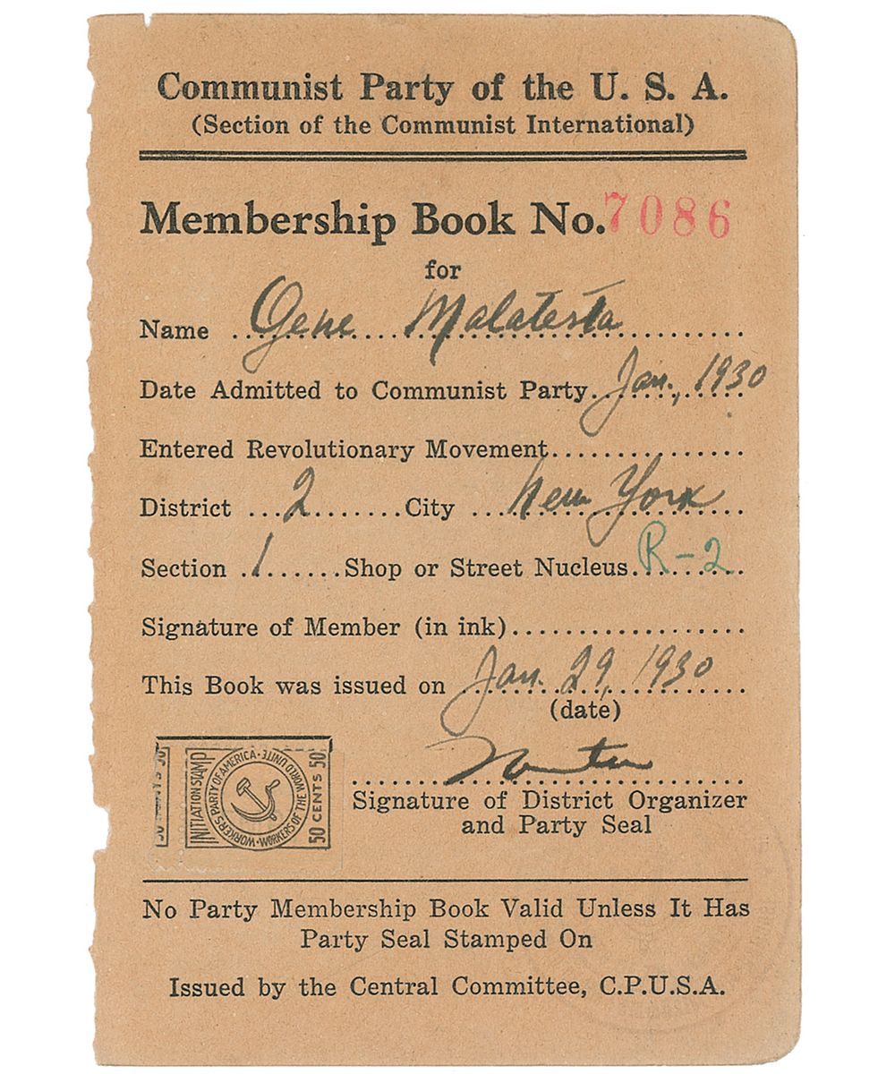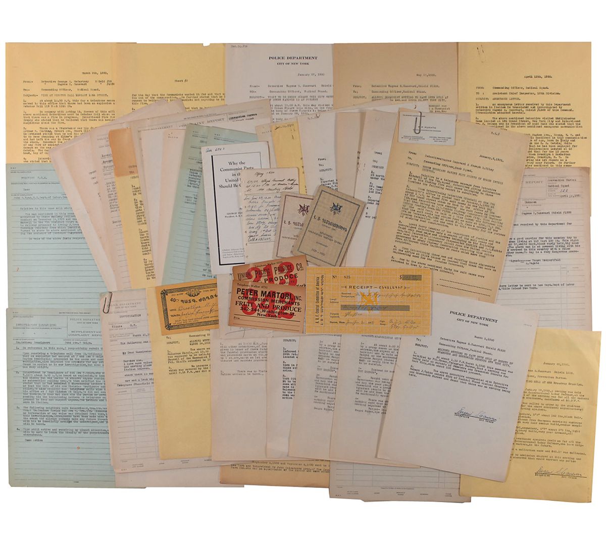 Fascinating collection of NYPD reports and documents related to Communist meetings and events, dated from throughout the 1930s. Canevari had gone undercover as “Gene Malatesta” in order to infiltrate these meetings and make reports. Consists of over 50 pieces (many original carbon copies), primarily typed police reports and anonymous tips, a few booklets and documents in Russian, and Canevari’s Communist Party of the U. S. A booklet identifying him by his undercover name “Gene Malatesta.” One report references a ceremony for Steve Katovis, a communist killed during a demonstration, in part: “The body is draped in a Red Flag marked Communist Party…There are three pictures at the head of the coffin one of which is Lenin.” Another report, in part: “Speakers dwelt on for all the workers to join the International Labor Defense.” A complaint report, in part: “Try to know who really is the gentleman…Pierto Certo…arrived in this country with a false American Passport under another name. To day is a very dangerous Anarchist and a big Bottlegger [sic].” Another report, in part: “The International Anarchistic element may attempt some terroristic act at the forth coming wedding between H. R. H. Prince Humbert of Italy and Princess Marie Jose of Belgium.” In overall fine condition, with expected document wear. Provenance: Eugene Canevari Collection.