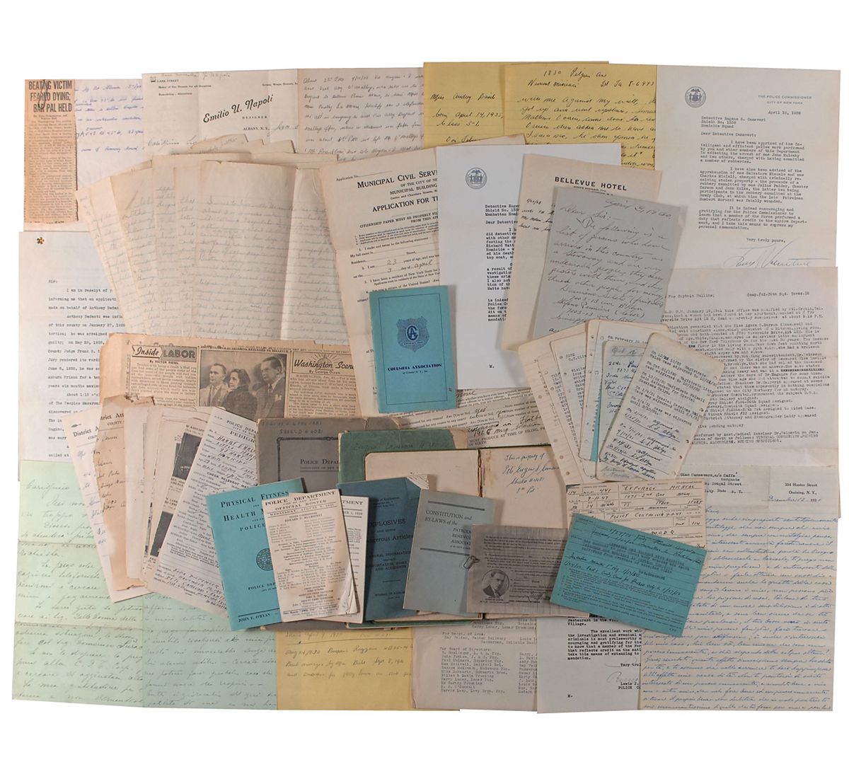 Impressive archive of Canevari’s papers, consisting of well over 80 pieces dated between the 1930s and 1950s, primarily typed reports, handwritten notes, letters, newspapers related to his investigations, and his 1937 Long Island Railroad Company identification card, listing him as “Shield No. 1338, Hom[icide] Sqd.” Also includes a few early police manuals that offer insight into the procedures and methods of the NYPD in the 1930s. In overall very good to fine condition. Provenance: Eugene Canevari Collection.