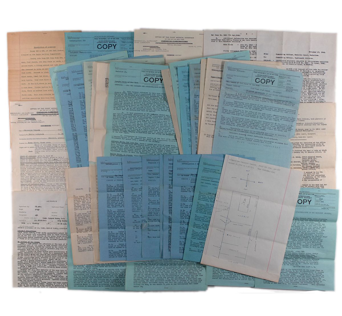 Large collection of NYPD reports and documents related to homicide cases, dated from throughout the 1930s. Consists of over 50 pieces (many original carbon copies), including typed police and autopsy reports, a few anonymous tips, and a sketched diagram of a crime scene. Causes of death from various reports include “stab wounds of the chest,” “poisoning,” “discharged 32. Cal. Automatic,” and “a gun-shot wound in left chest.” An anonymous tip, in part: “Pick up Mr. Willie Albert the bond’s man and his brother Urey Albert they can tell you more about murdered people than any policeman.” In overall fine condition, with expected document wear. Provenance: Eugene Canevari Collection.