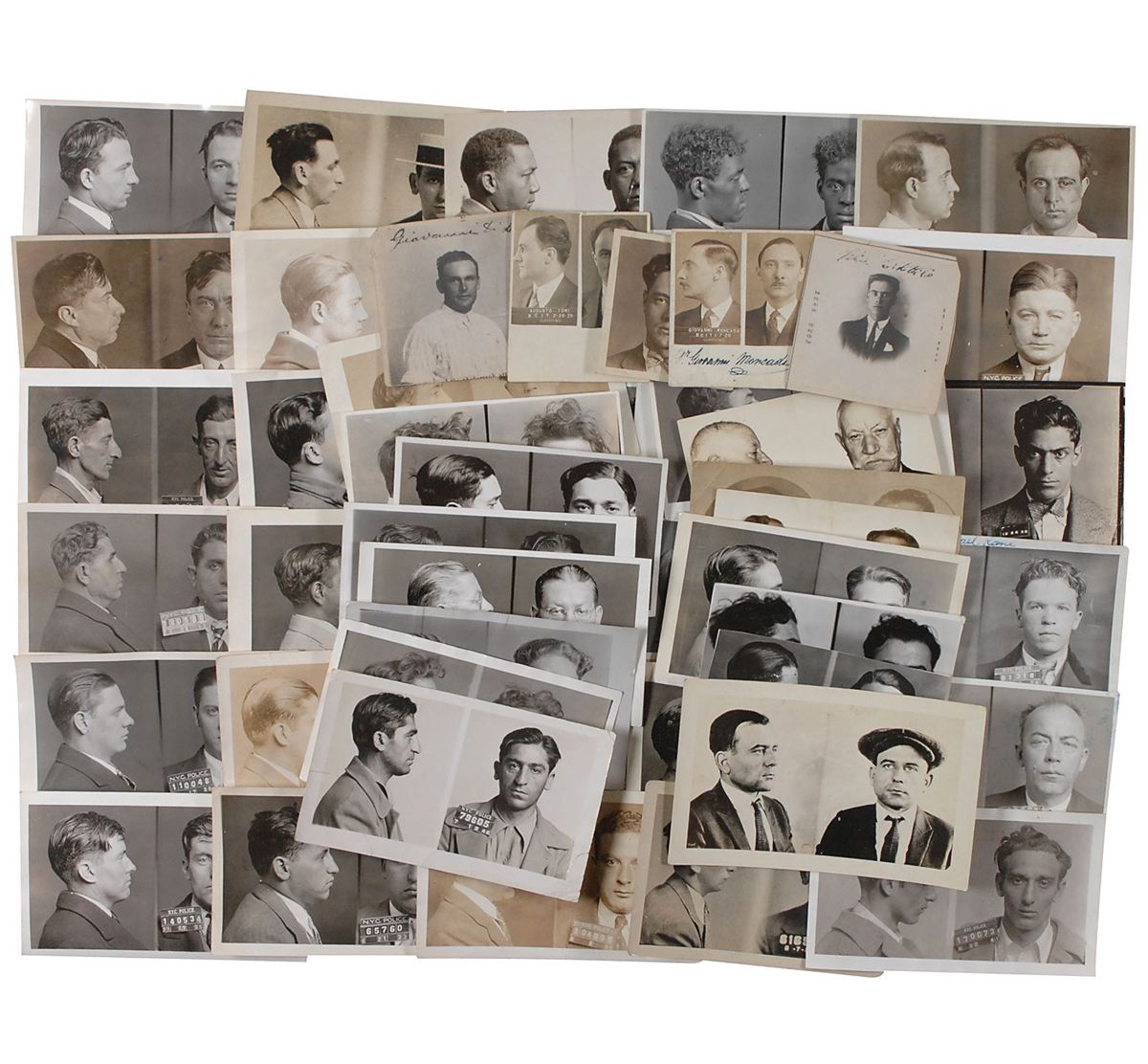Collection of approximately 50 original mug shot photos, most approximately 5 x 3, featuring various suspected criminals, most with physical descriptions and personal information filled out on the reverse. Crimes listed include “Burglary,” “Narcotics & Revolver,” “Homicide,” “Coercion,” and “Assault & Robbery.” In overall fine condition, with expected general wear. Provenance: Eugene Canevari Collection.