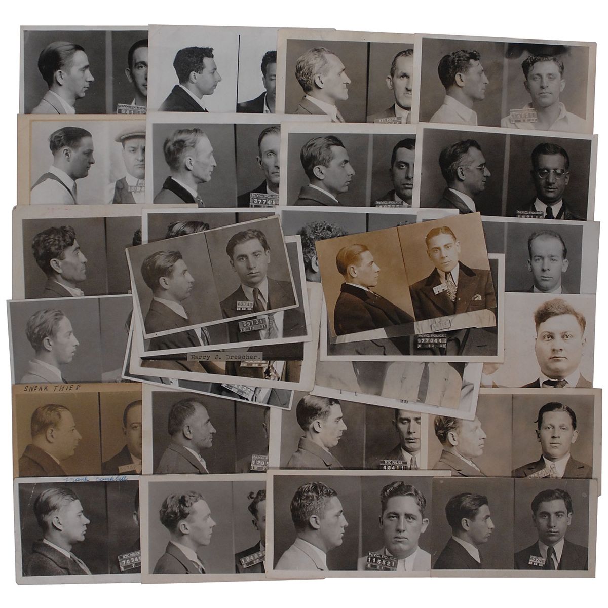 Collection of approximately 34 original mug shot photos, most approximately 5 x 3, featuring various suspected criminals, most with physical descriptions and personal information filled out on the reverse. Crimes listed include “Homicide,” “Vagrancy,” “Assault & Robbery,” “Gr. Larceny,” and “Harrison Act.” One notable criminal included is Jacob Schaffer, charged with homicide, whose description lists him as a “Lepke asso”; Louis ‘Lepke’ Buchalter was the head of Murder, Inc. In overall fine condition, with expected general wear. Provenance: Eugene Canevari Collection.