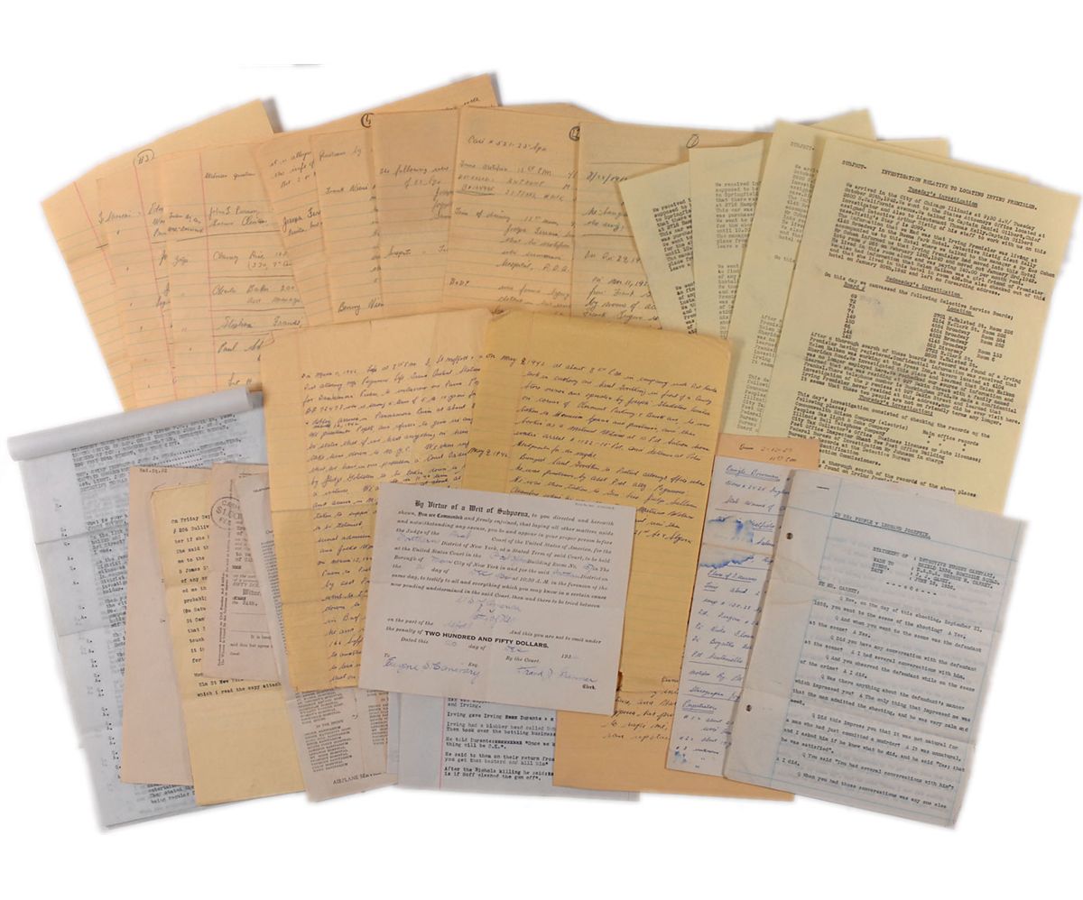 Large collection of NYPD reports and documents related to interrogations and witness testimonies, dated between the 1920s and 1950s. Consists of approximately 27 pieces, primarily including typed and handwritten police reports and witness lists. One memo, in part: “The defendant answered: ‘I had her in there and dragged her out into the hall…I’m not going to say no more.” Another report, in part: “‘I then turned around and seen Georgio DiScalo come at me with a knife and attempt to stab me…I then pulled my knife from my back pocket and stabbed him.’” In overall fine condition, with expected document wear. Provenance: Eugene Canevari Collection.