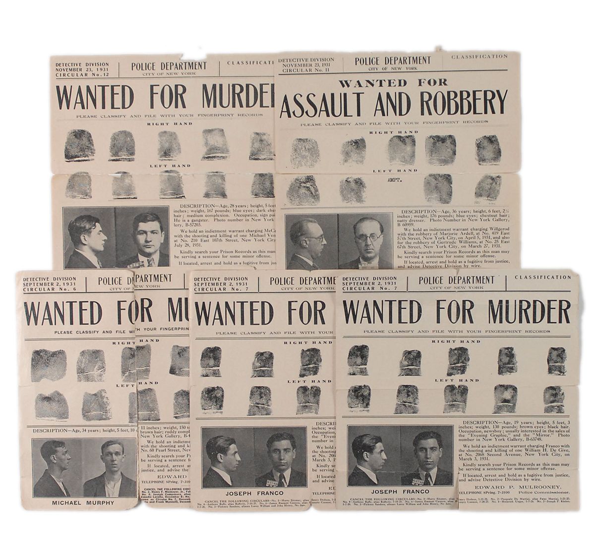 Five wanted posters issued in 1931, two of which are identical, each 8 x 8, featuring images, descriptions, and fingerprints of the wanted suspects. Three of the men were wanted for murder, and one for assault and robbery. Central storage folds (three posters with full separations), otherwise very good condition. Provenance: Eugene Canevari Collection.