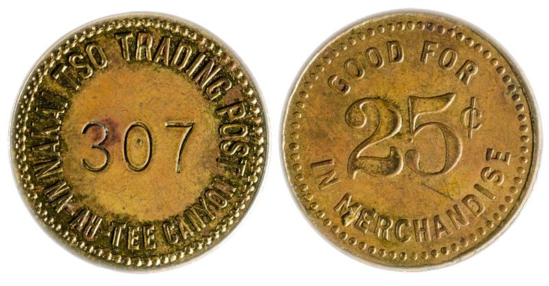 Obverse: Nakaitso Trading Post / (incuse number) / Na-Ah-Tee Canyon; reverse: Good For / 25c / In Merchandise. Br, 26mm, R6. Very fine condition, carbon spot over incuse number.