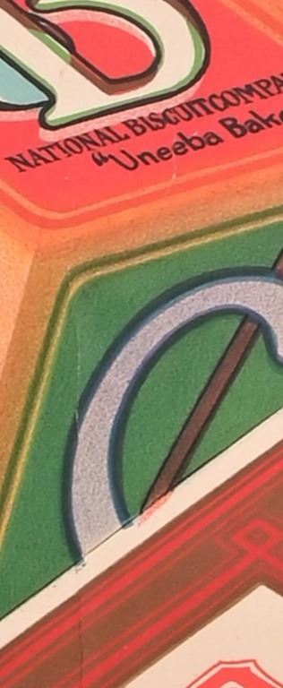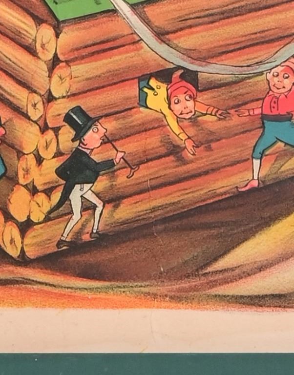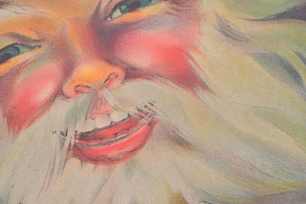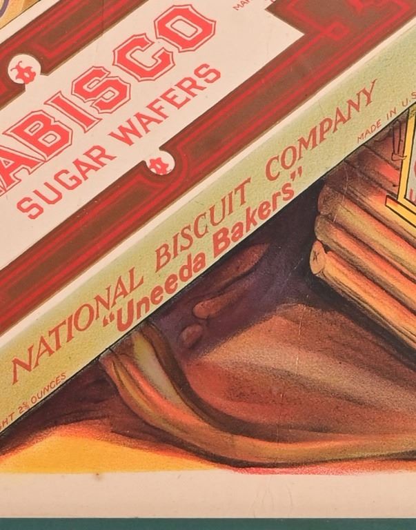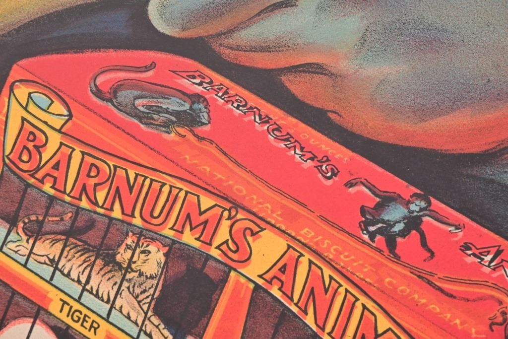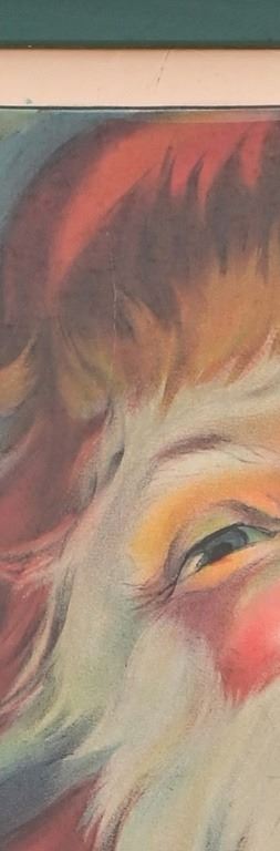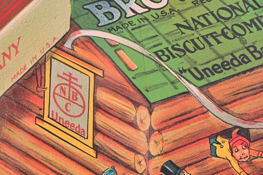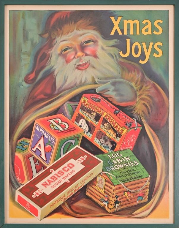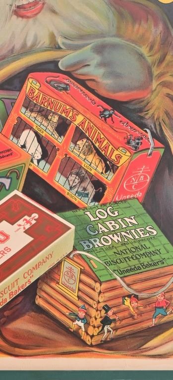 "Xmas Joys", 29x37 lithograph printed paper sign advertising Nabisco cookies, Barnum Circus animal crackers and Log Cabin brownies. Early 1930s, pre-war Santa Claus.