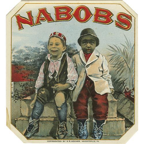 <B><I>Nabobs</B></I></B></I><B> Black Americana Cigar Label by S.R. Kocher, Wrightsville, Pennsylvania.</B></I> A full color lithographed 4.25" x 4.25" outer label with embossed brand name having gold edging. Two street urchins, one black and one white, are shown seated together. Despite his extreme youth, the white kid is holding a lit cigar. Both are probably second grade dropouts. Clipped corners as made. Near mint.<BR><BR><b>Shipping:</b> Small Flat (<a target="_blank" href="http://www.heritageauctions.com/common/shipping.php">view shipping information</a>)