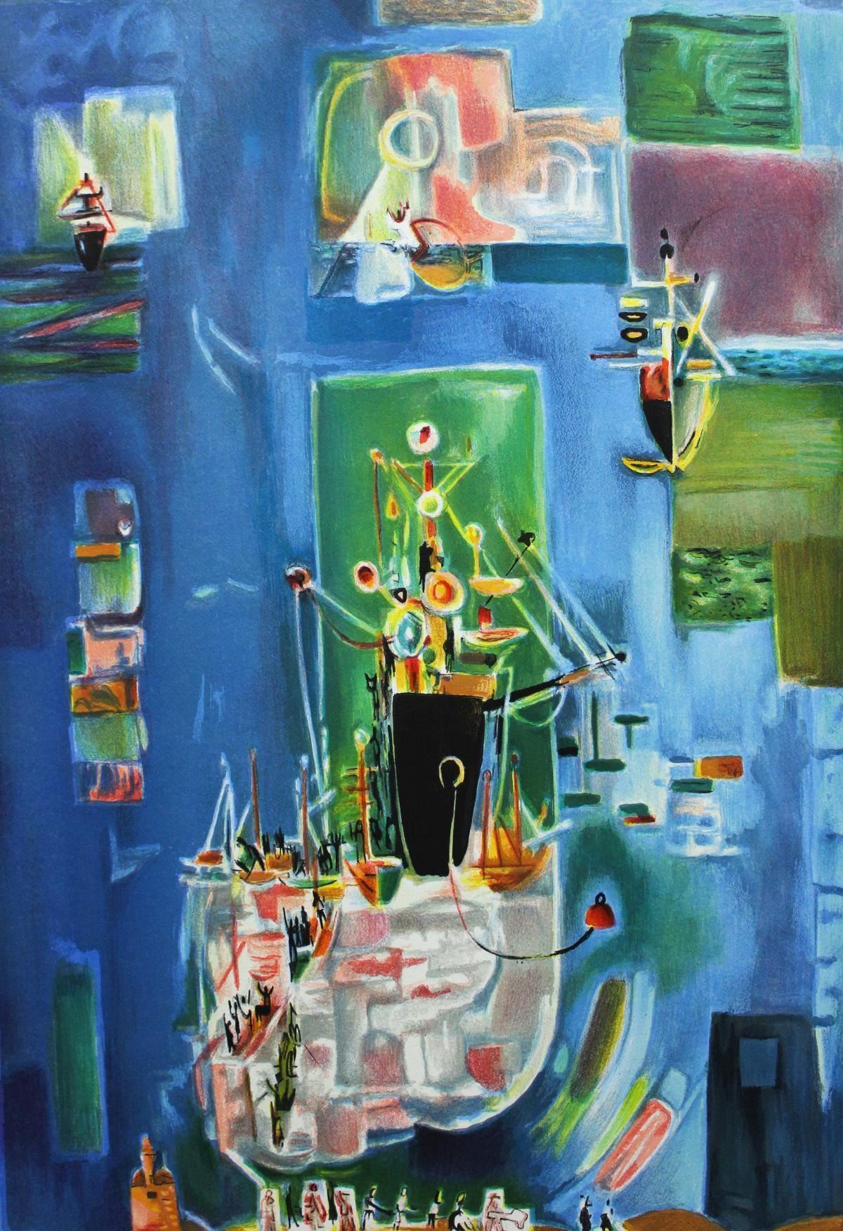 Artist: Nachum Gutman. Medium: Original Lithograph. Title: Blue Ships. Size (Unframed): 27.5" x 20". Certificate of Authenticity: Is Included.
