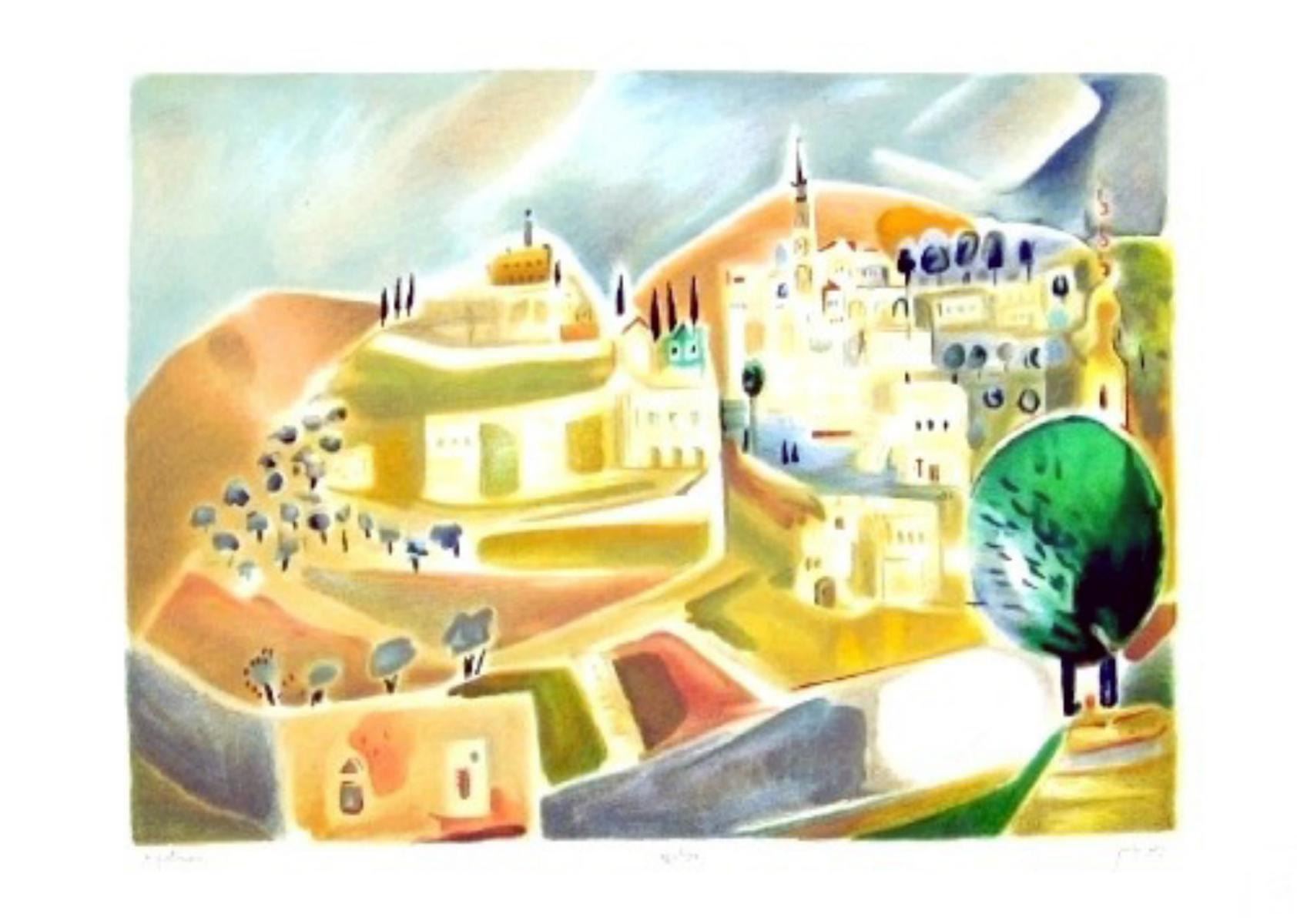 Artist: Nachum Gutman. Medium: Original Lithograph. Title: Ein Kerem. Size (Unframed): 20" x 27.5". Certificate of Authenticity: Is Included.