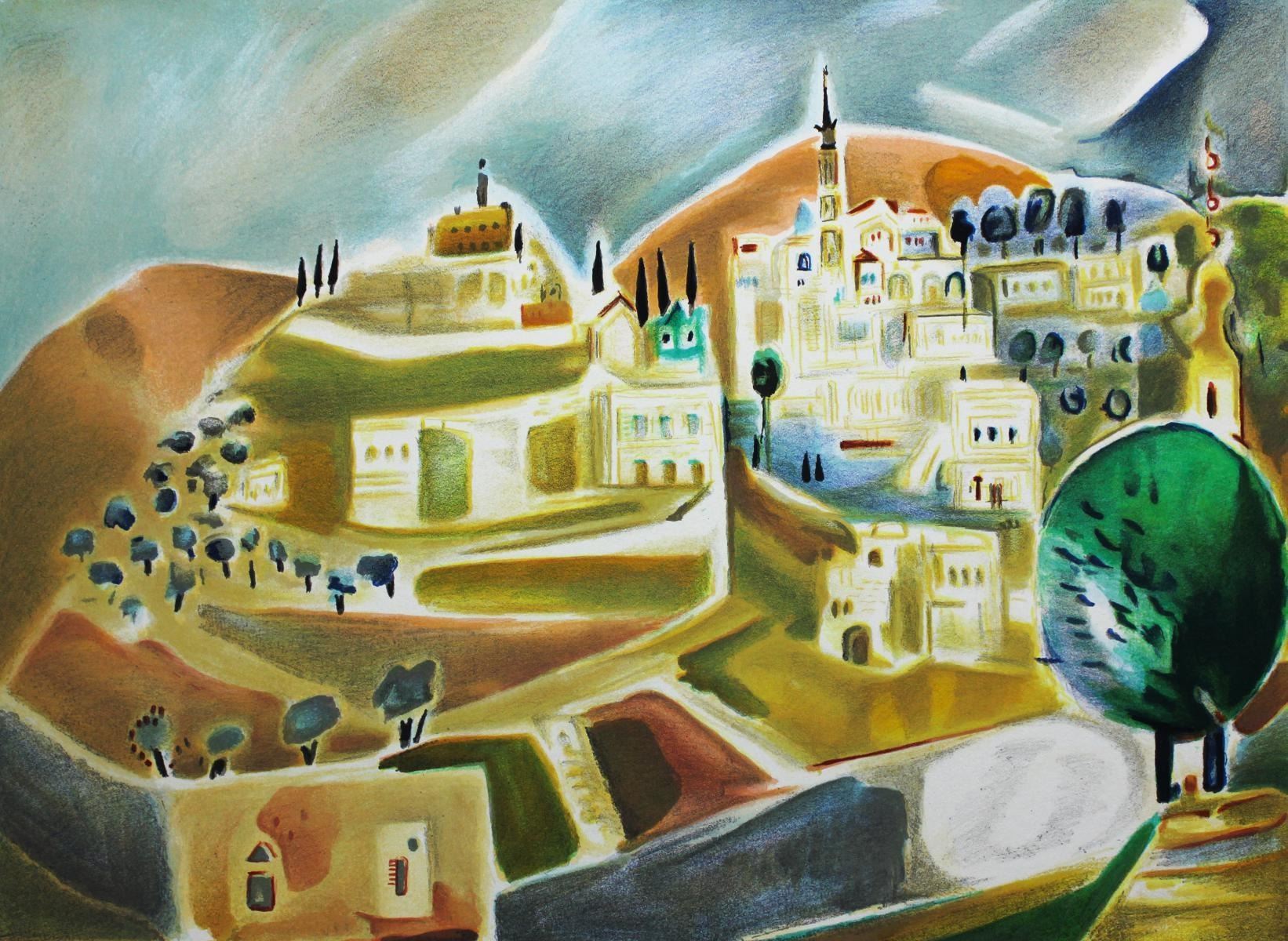 Artist: Nachum Gutman. Medium: Original Lithograph. Title: Ein Kerem. Size (Unframed): 20" x 27.5". Certificate of Authenticity: Is Included.