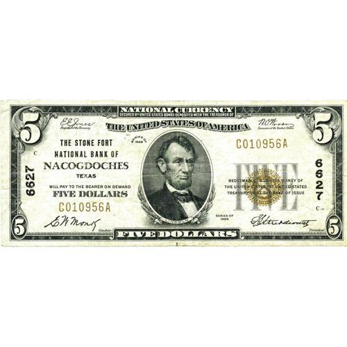 <B>Nacogdoches, TX</B></I> - $5 1929 Ty. 1 <B>The Stone Fort NB</B></I> Ch. # 6627<BR>Around 1779, Don Antonio Bil Y'Barbo, founder of Nacogdoches, built a stone house, the formal portal to the Spanish District of Texas. This bank, founded in 1903 was named after that historically important building, which was torn down the year before. The stones were subsequently used in a structure at Stephen F. Austin University. This note is wholly original with most pleasing eye appeal. <B>Fine-Very Fine.</B></I>