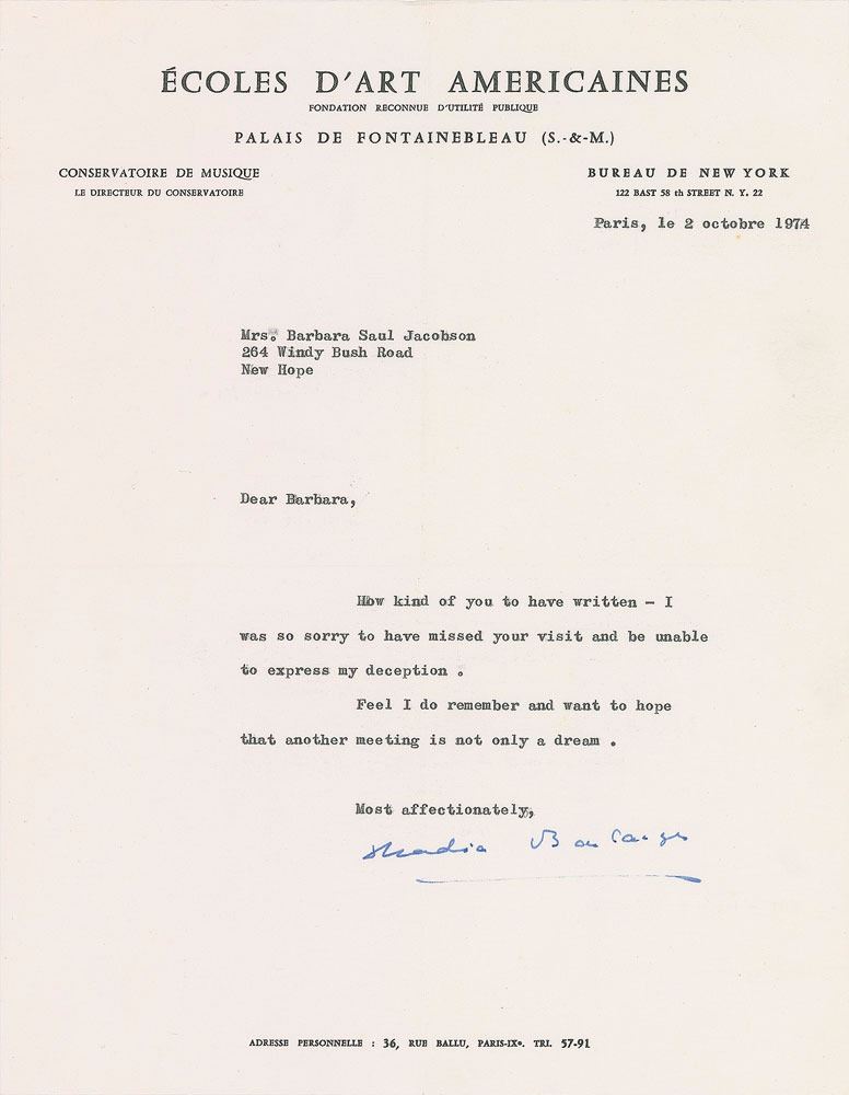 TLS, one onionskin page, 8.25 x 10.75, Ecoles d'Art Americaines letterhead, October 2, 1974. Letter to Mrs. Barbara Saul Jacobson. In full: "How kind of you to have written-I was so sorry to have missed your visit and be unable to express my deception. Feel I do remember and want to hope that another meeting is not only a dream." In fine condition. Accompanied by the original mailing envelope, a candid snapshot of Boulanger from 1972, and a hardcover copy of her biography Nadia Boulanger: A Life in Music.