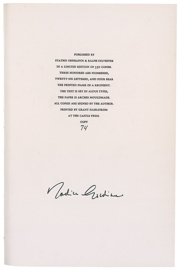 Signed book: Town and Country Lovers. Limited edition of 330 copies (this copy No. 74). Los Angeles: Sylvester and Orphanos, 1980. Hardcover, 6.75 x 10, 26 pages. Signed on the colophon page in black ink by Gordimer. In fine condition.