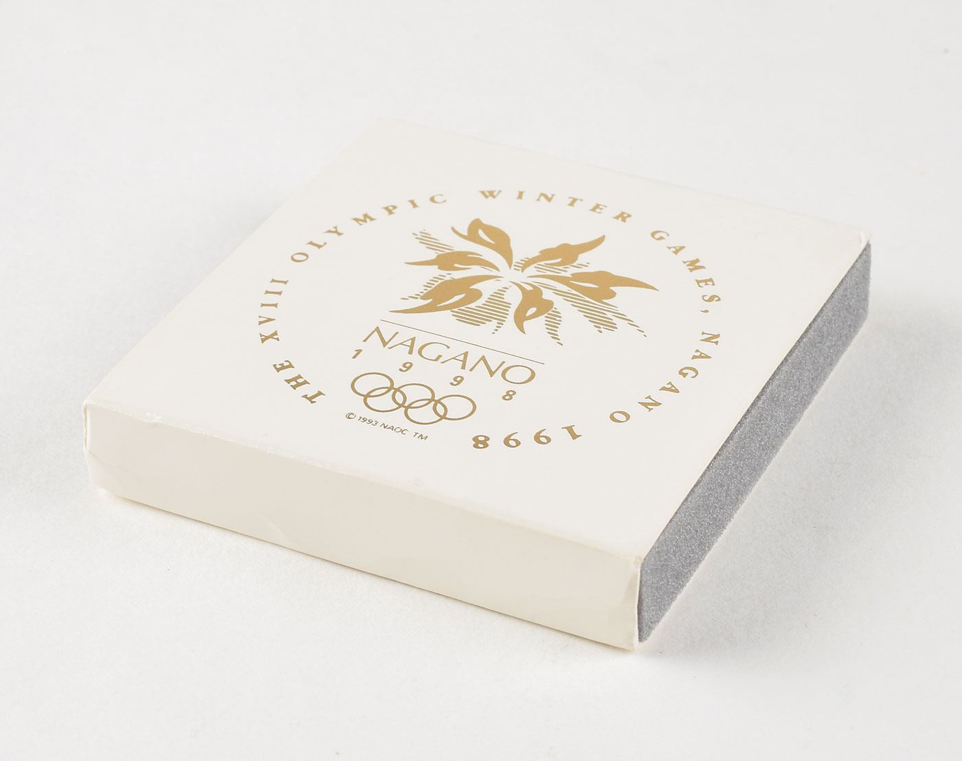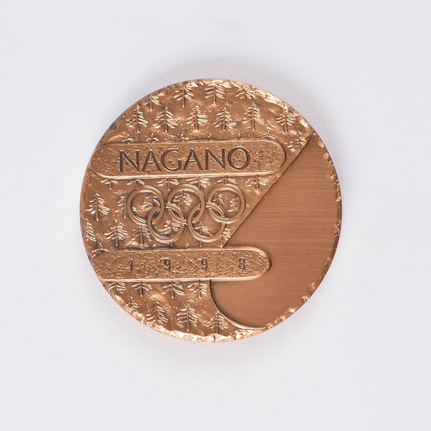 Participation medal issued for the Nagano 1998 Winter Olympics. Bronze, 60 mm, 137 gm. The front features a forest of small trees on a mountain side with a curve denoting a ski slope; the reverse bears the Nagano Games logo and a wreath effect along the rim. Complete with its original white paper sleeve with foam holder.
