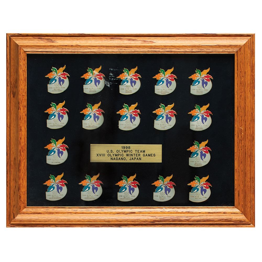 Collection of 17 Team USA Olympic pins from the Nagano 1998 Winter Olympics, each 38 mm x 38 mm, which includes the following events and staff: Alpine Skiing, Biathlon, Bobsled, Cross Country Skiing, Curling, Freestyle Skiing, Figure Skating, Ice Hockey, Luge, Short Track Speed Skating, Ski Jumping, Ski Nordic Combined, Snowboarding, Speed Skating, Sports Medicine, Staff, and one blank. The pins are mounted and framed with an engraved plaque to an overall size of 14 x 11. In overall fine condition.