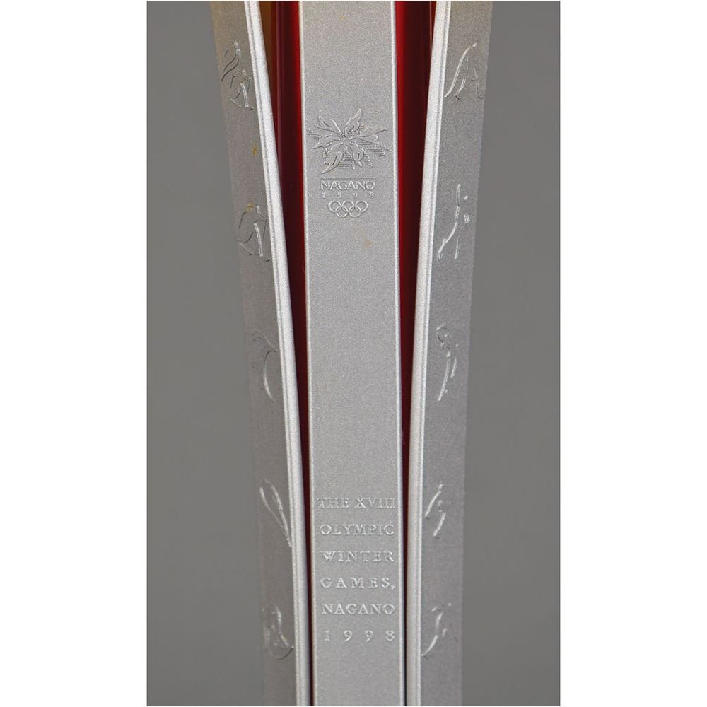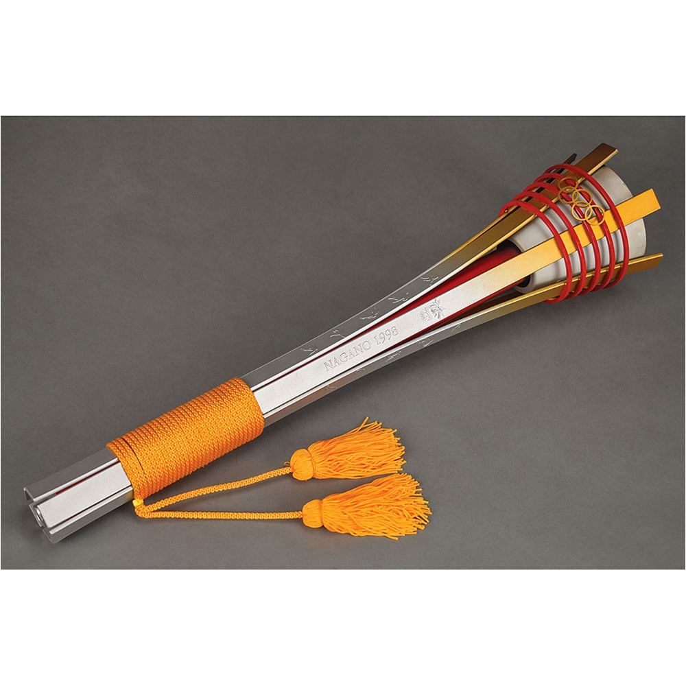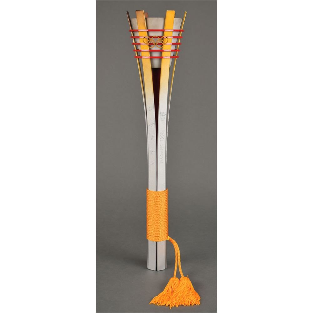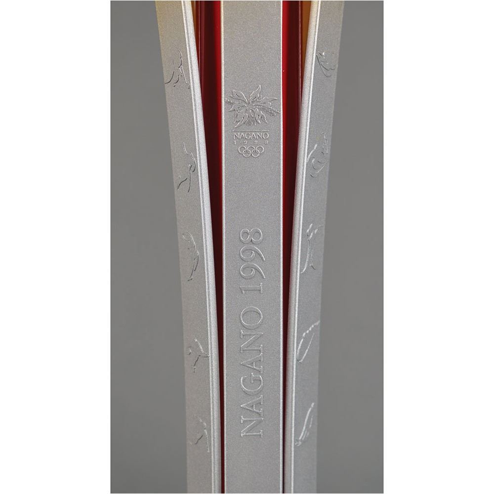 Official 1998 Nagano Winter Olympics torch, comprised of aluminum and cotton, measuring 21.5? in length and 4.75? at its widest point. Manufactured by the Katsura Co., and designed by the Nagano Olympic Games Organizing Committee, the torch was inspired by pine branch torches called taimatsu that were used in the past in Japan. The hexagonal shape of the body represents snow crystals, with the silver color chosen to resemble a wintry landscape; when turned upside-down, the torch gives the resemblance of a Bonsho bell found in Buddhist temples. The six silver-colored vertical bands are adorned with raised pictograms of fifteen sporting events, as well as the Nagano Games logo and text in both English and French, “The XVIII Olympic Winter Games, Nagano 1998.” The five red rings mounted to the top bear gold-colored Olympic rings, and the yellow rope wrapped to the lower handle is a reference to a traditional element of Japanese design. Includes the original shipping box.
