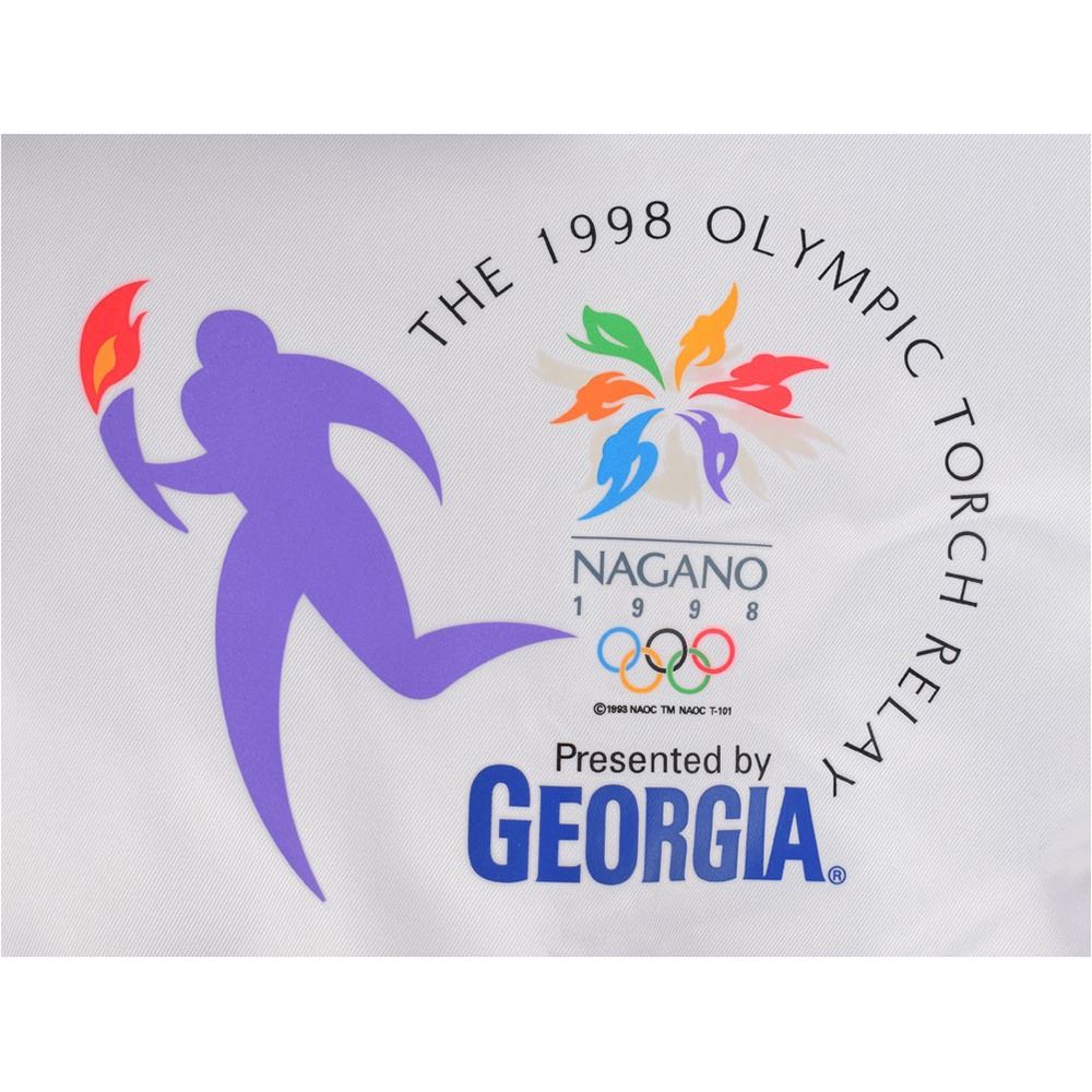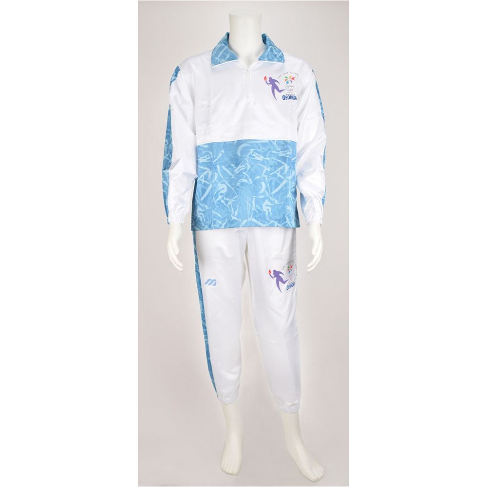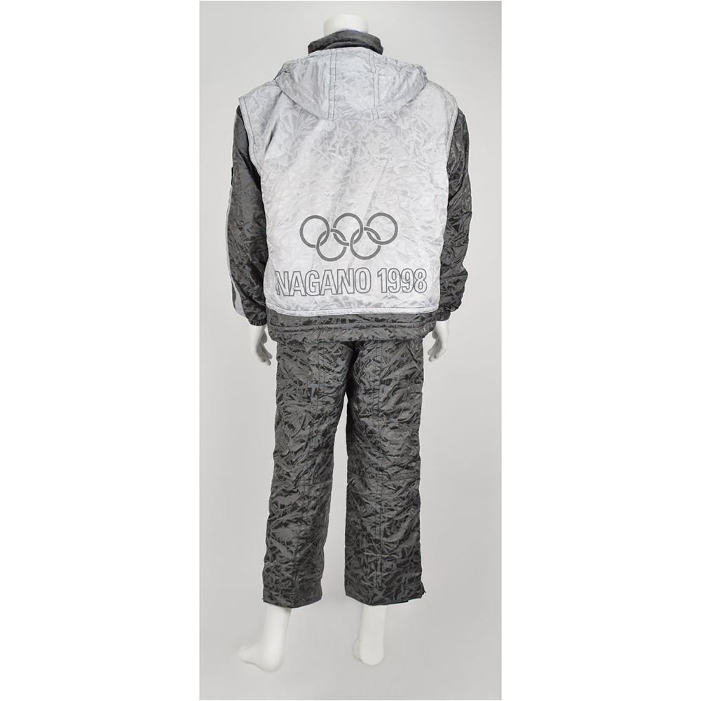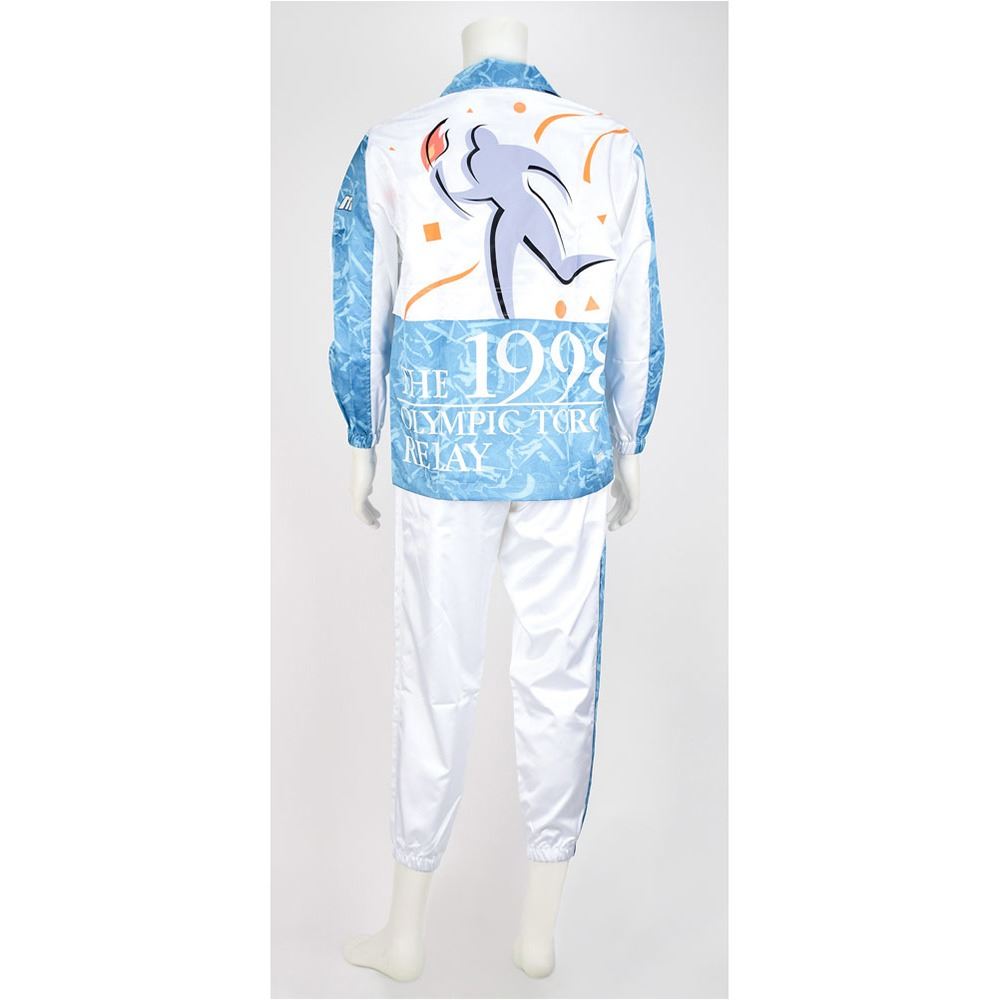The torch is accompanied by the official Nagano 1998 Winter Games torch relay suit by Mizuno, size SS, consisting of white-and-blue shell jacket and pants with both featuring stylized torch relay logos. Also included is the official torch relay 'cold weather' volunteer suit by Mizuno, size B–L, consisting of a baseball cap with ear flaps, stylish insulated snow pants, and a warm winter jacket, with cap and jacket featuring various Nagano 1998 emblems.