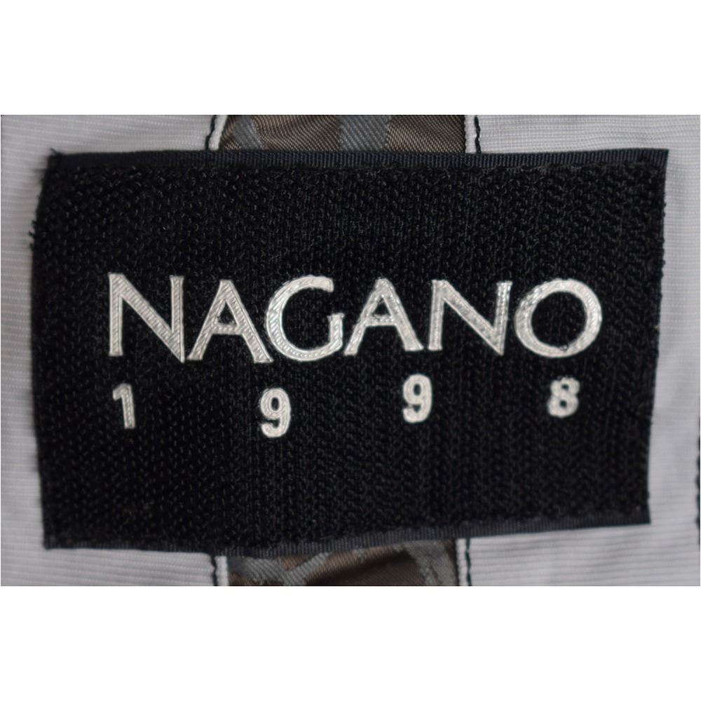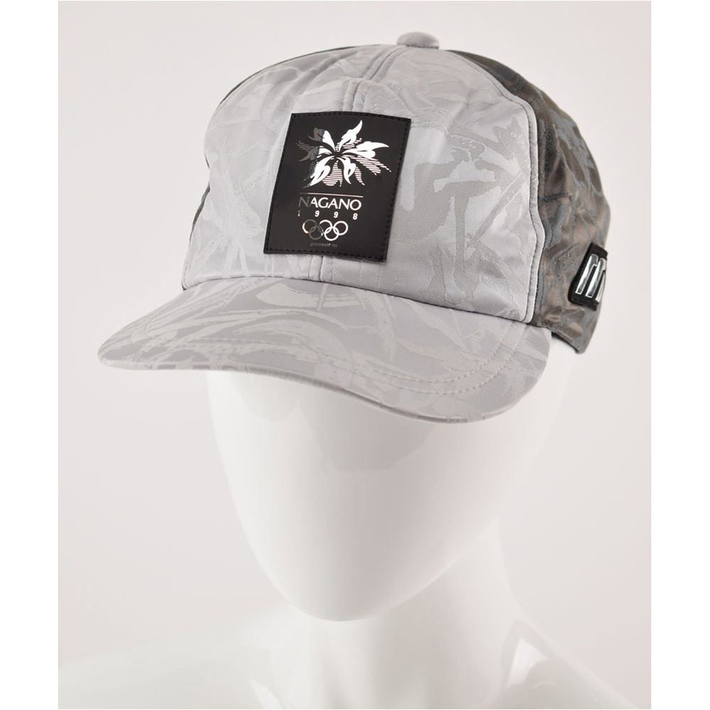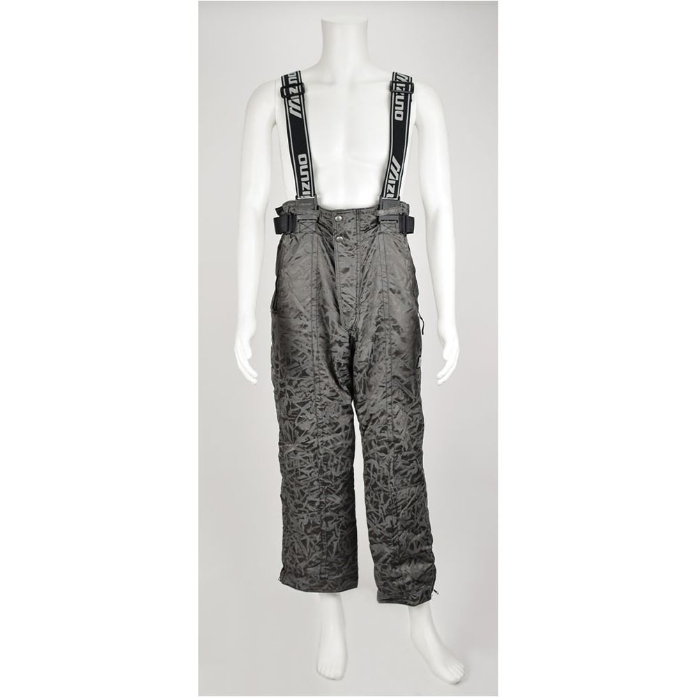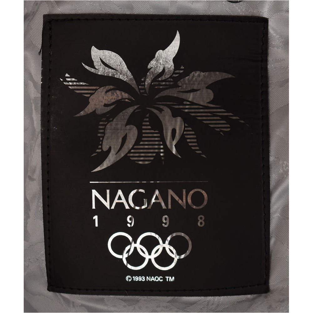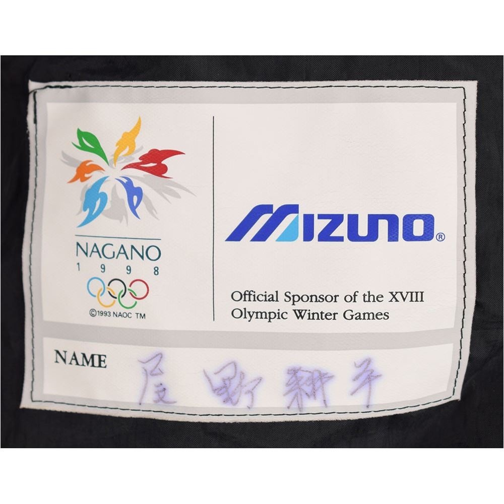 The torch is accompanied by the official Nagano 1998 Winter Games torch relay suit by Mizuno, size SS, consisting of white-and-blue shell jacket and pants with both featuring stylized torch relay logos. Also included is the official torch relay 'cold weather' volunteer suit by Mizuno, size B–L, consisting of a baseball cap with ear flaps, stylish insulated snow pants, and a warm winter jacket, with cap and jacket featuring various Nagano 1998 emblems.