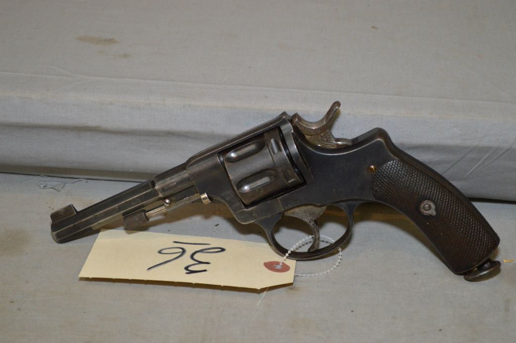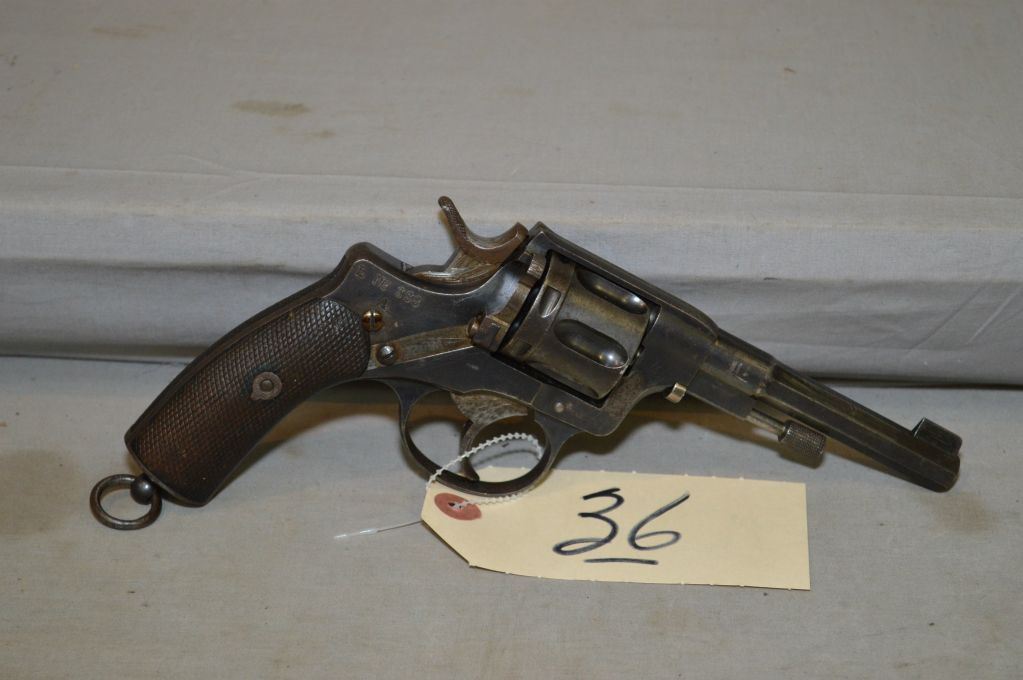 Nagant ( Husqvarna ) Model 1887 7.5 MM Nagant Cal 6 Shot Revolver w/114 mm bbl [ blued finish starting to fade, with some light pitting in spots, checkered wooden grips, w/lanyard ring, stamped Ser # 841 stamped in three places on left side, right side stamped L No. 338A , low serial number made prior to 1898 ] ANTIQUE NO PAL REQ