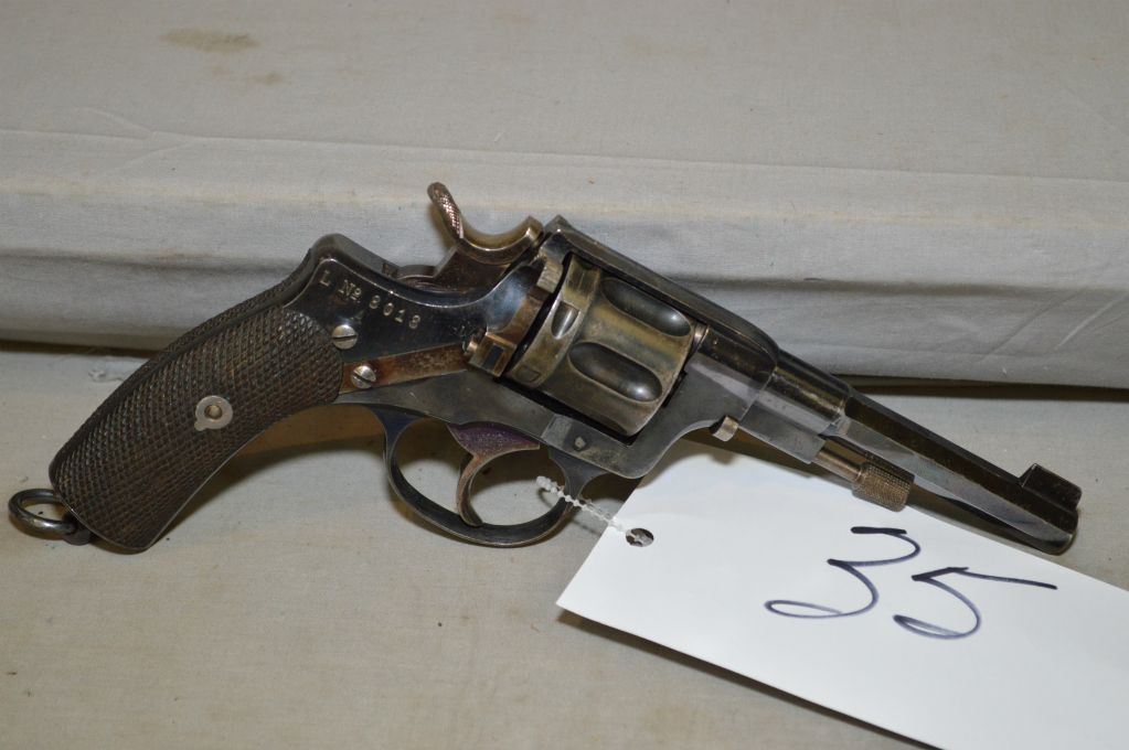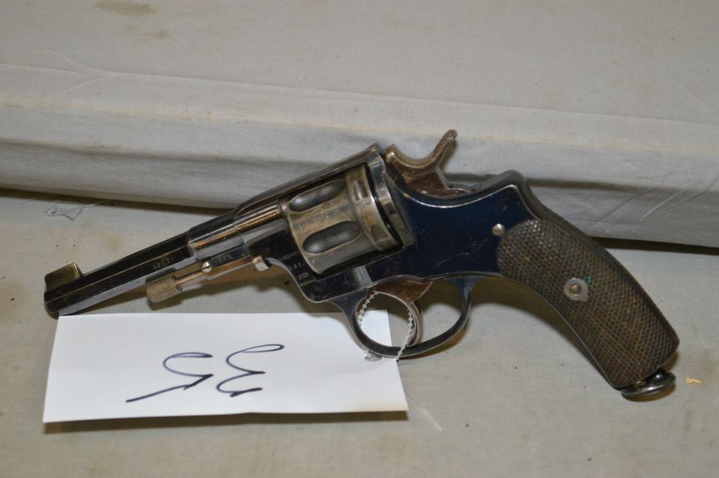 Nagant by Husqvarna Model 1887 7.5 MM Cal 6 Shot Revolver w/ 114 mm bbl [ good bright blue finish fading in some areas, mostly the cylinder, barrel & frame numbered 1811 on left side, right side stamped L No. 8018A, good checkered grips, w/lanyard ring ] Registered With Ser # 8018 Restricted Handgun Cert # 17447996