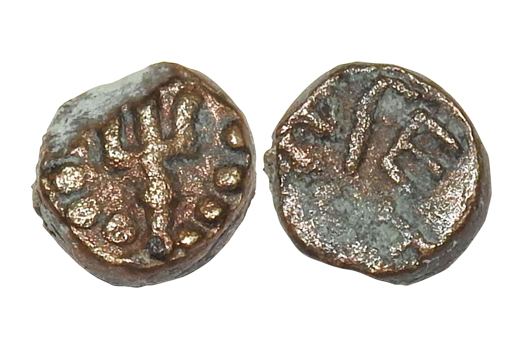 Nagas of Padmavati, Copper coin of Deva Naga, c.325 - 335 AD, PAIC 1311, 1.20 grams. Obv: trident in dotted circle. Rev: Brahmi legend Maharaja Shri…. inscribed circular. Very fine+, Scarce.