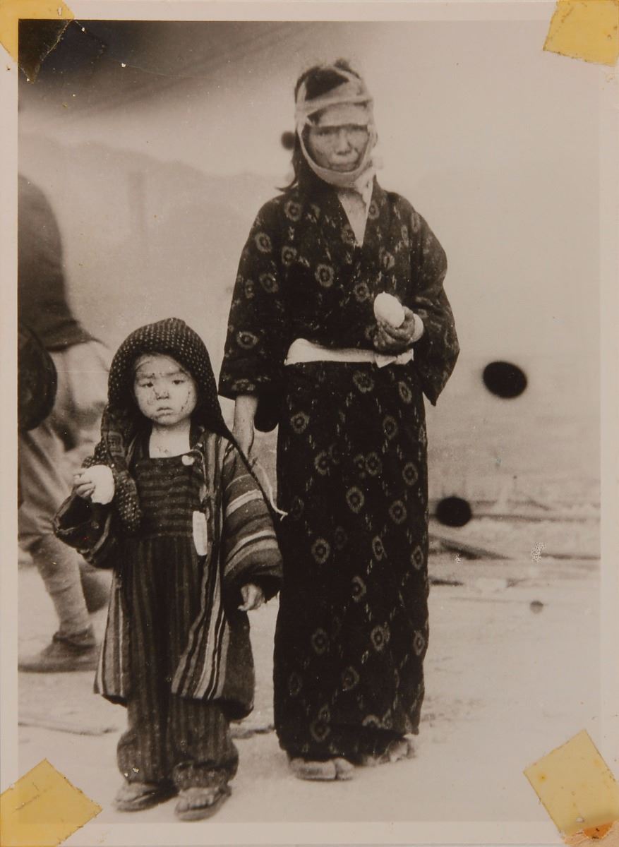 Yamahata’s published images are often contradictory. On examination of Yamahata’s existing 35mm negatives, it became clear that one of his cameras had a defective frame advance mechanism. Furthermore, wartime scarcities and a government prohibition on civilian photography had resulted in a severe shortage of film stock; what remained even for military use was of varying quality, its unreliability further handicapping Mr. Yamahata’s efforts. Either could explain the glossy and matte finishes of the photographs in this album. In preparation for this book in 1995 an evaluation of the existing negatives both original and copies was under taken. Due to the degree of damage caused by light leaks, scratches, dust marks, emulsion flaking, and fogging a decision was made to digitally restore the negatives. When the restoration was completed new 4? X 5? negatives were taken which then produced the images used in this book. This is significant relative to the photographs seen in this MP’s photo album which are from the original negatives and show detail not retouched as seen in ‘Nagasaki Journey.’ Compare looking at one of the most iconic images of the little boy next to his mother both holding rice cakes. You will notice in the MP’s album this image has two original black dots in the background. However the same image in ‘Nagasaki Journey’ those black dots have been removed making the 24 original photographs in this album as possibly the only known to exist. Yamahata’s photographs of Nagasaki remain the most complete record of the atomic bombing as seen immediately after the bombing, and the New York Times has called his photographs ‘some of the most powerful images ever made.’
